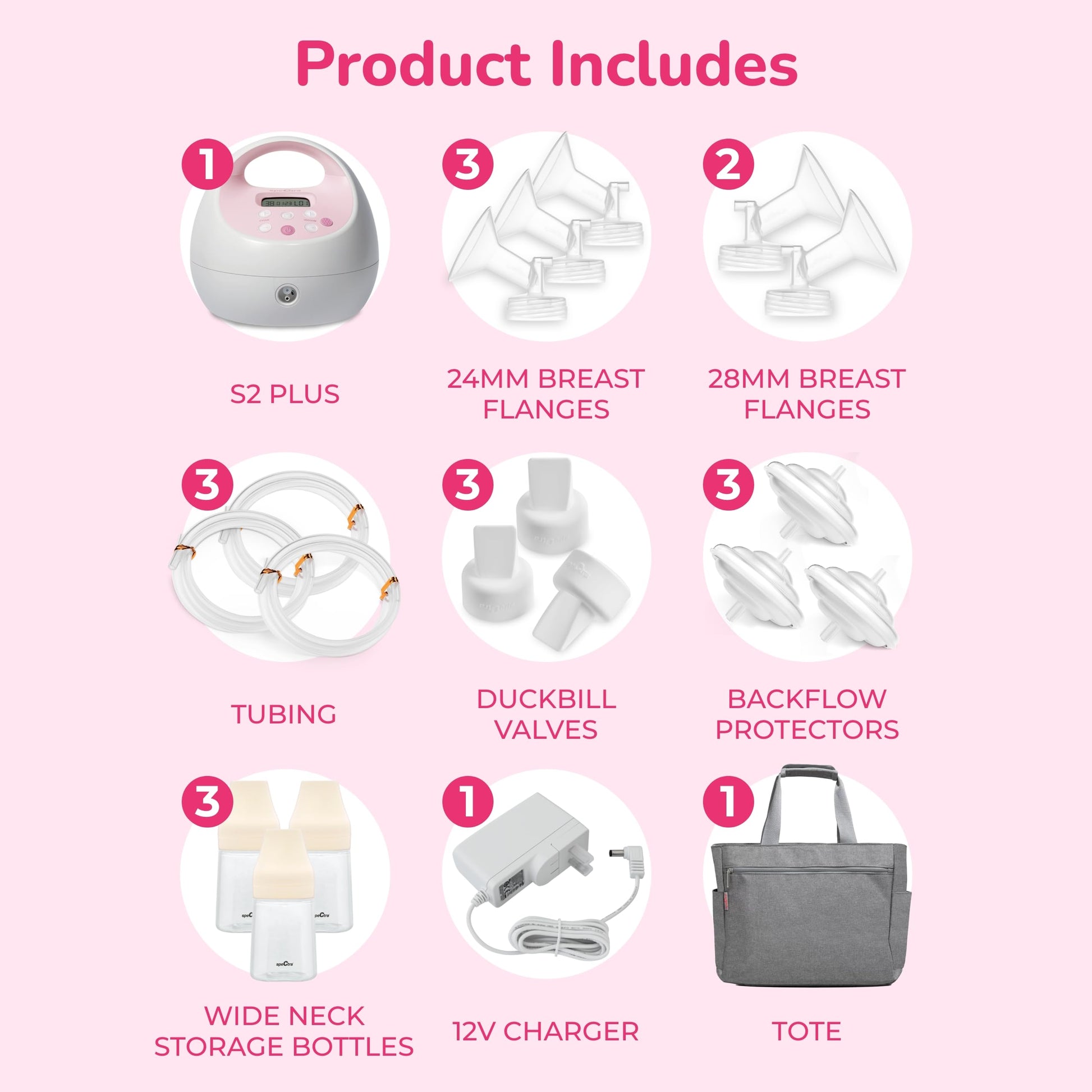 A complete bundle that gives you everything you need for your pumping journey. The bundle includes S2 Plus Premier Electric Breast Pump, Grey Tote, and our Premium Accessory Kit.