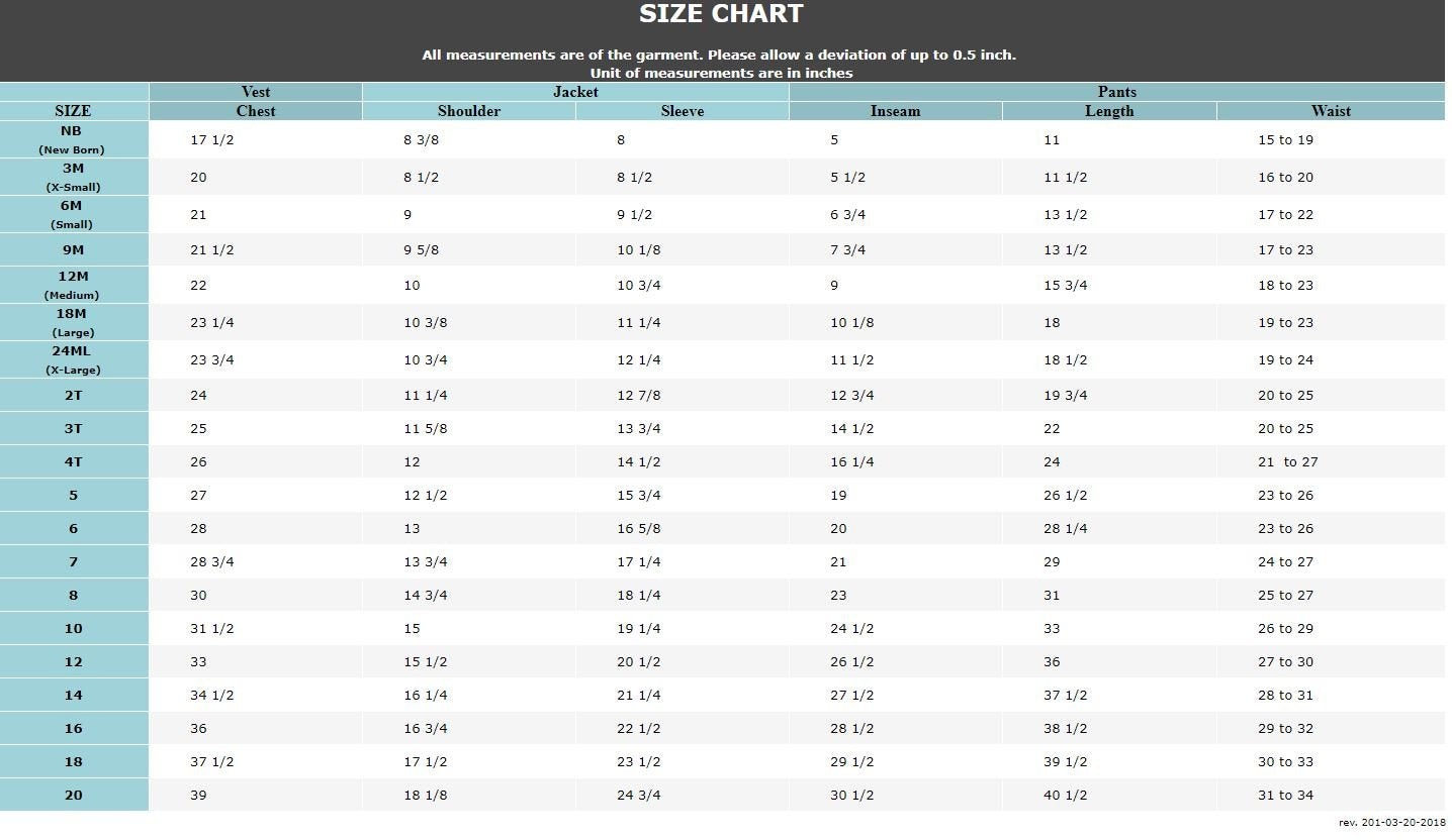 - Q: What age range does this tuxedo set fit? A: This tuxedo set is designed for baby boys and is available in size 12 months.