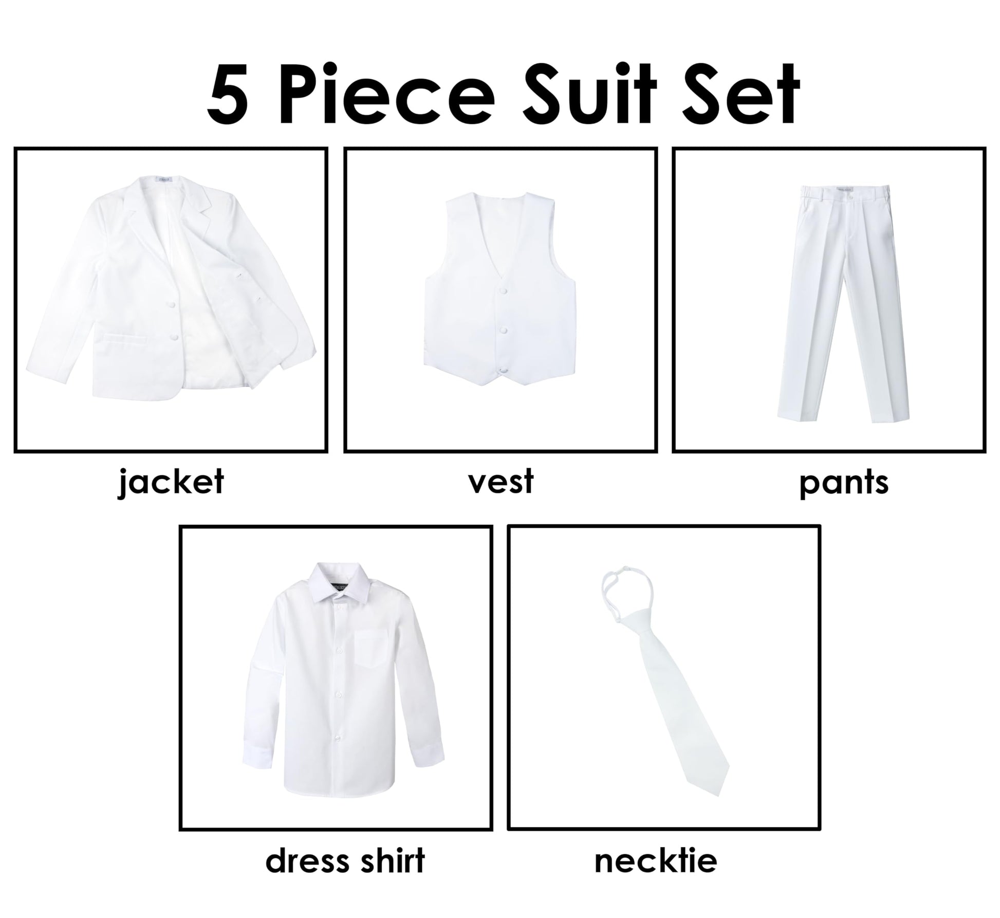 - Q: What is included in the Spring Notion Baby Boys' Classic Fit Formal White Dress Suit Set? A: The suit set includes a single-breasted jacket, vest, long-sleeve dress shirt, necktie, and pants, all designed for babies and toddlers.