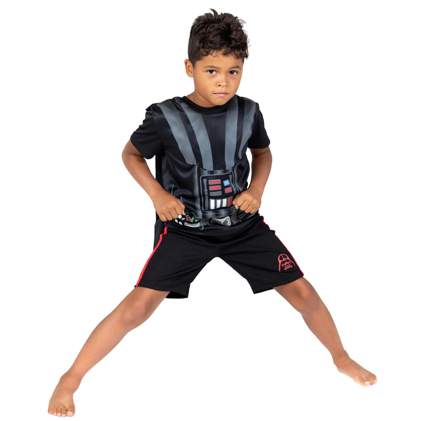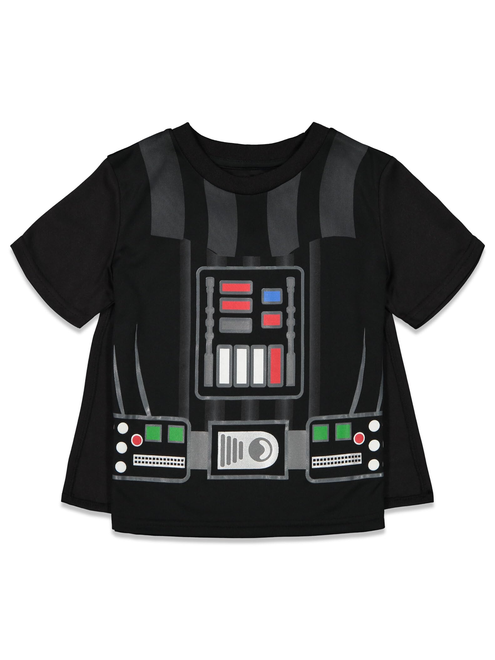 - Q: What is included in the STAR WARS Darth Vader costume set? A: The STAR WARS Darth Vader costume set includes a short sleeve graphic tee shirt, shorts, and a cape, making it a complete 3 piece outfit for big boys.