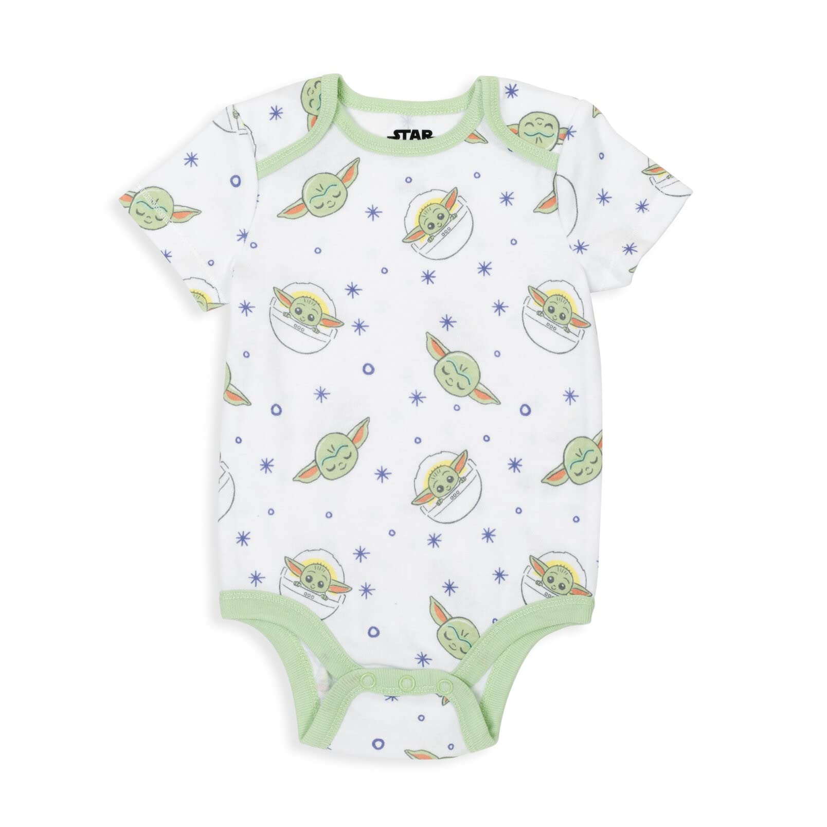 - Q: What design features does the bodysuit have? A: The bodysuit has an all-over print design featuring Grogu, also known as Baby Yoda, with rib knit binding for added comfort.