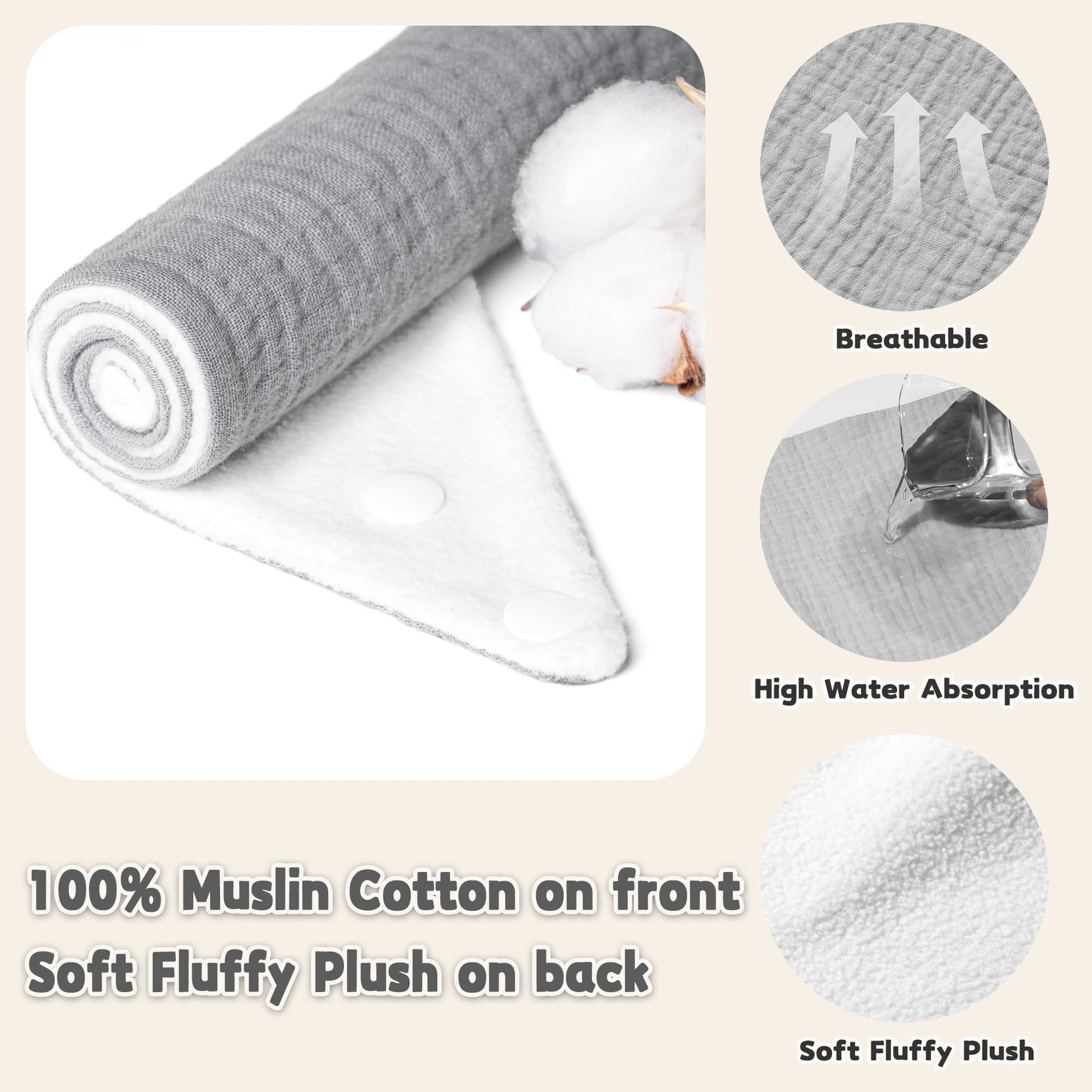 - Q: What materials are the Susurration Muslin Baby Drool Bibs made from? A: The Susurration Muslin Baby Drool Bibs are made from 100% cotton muslin on the front, with a water-resistant soft plush backing for maximum absorbency.