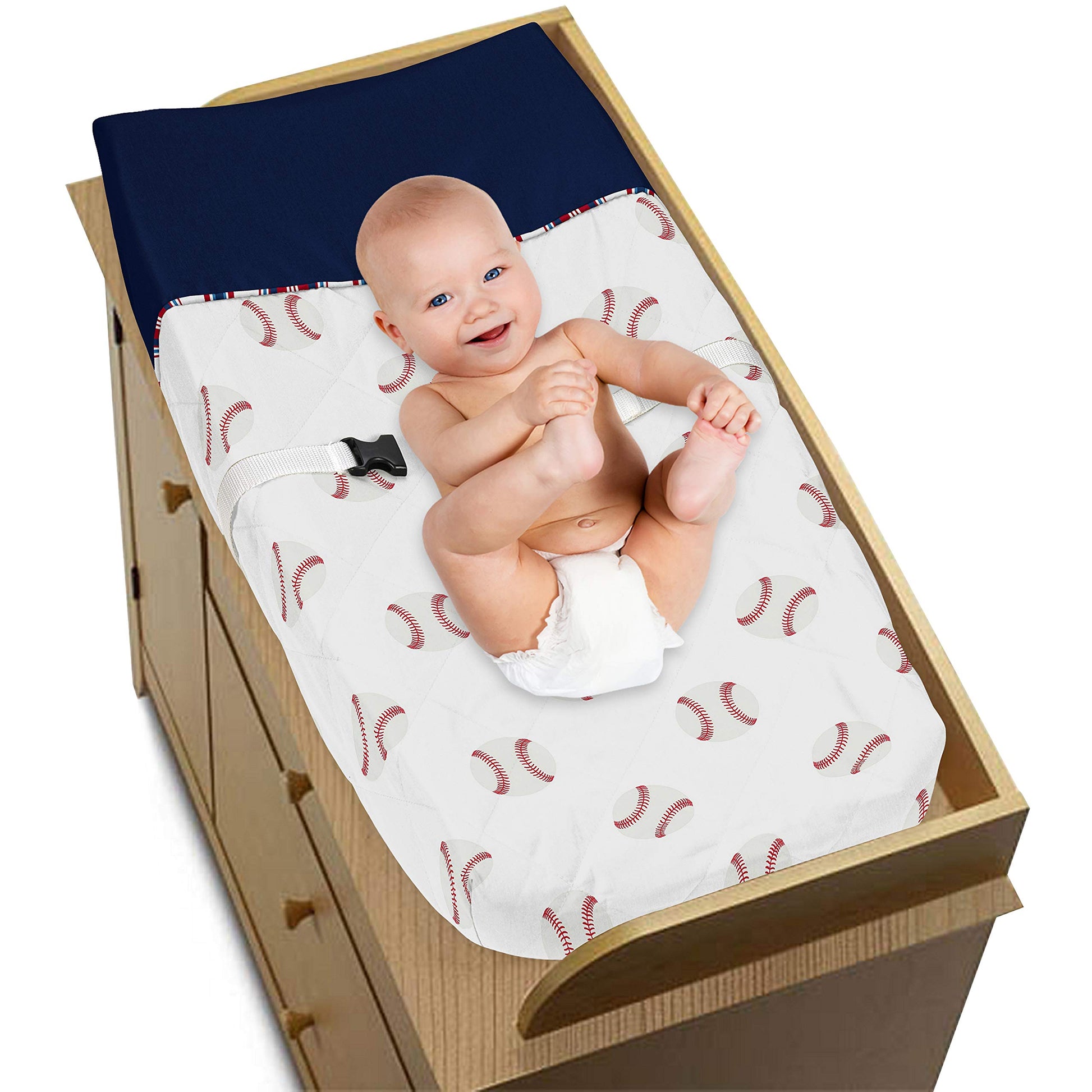 - Q: What colors are featured in the Sweet Jojo Designs Changing Pad Cover? A: The changing pad cover features a red, white, and blue color scheme, perfect for a baseball-themed nursery.