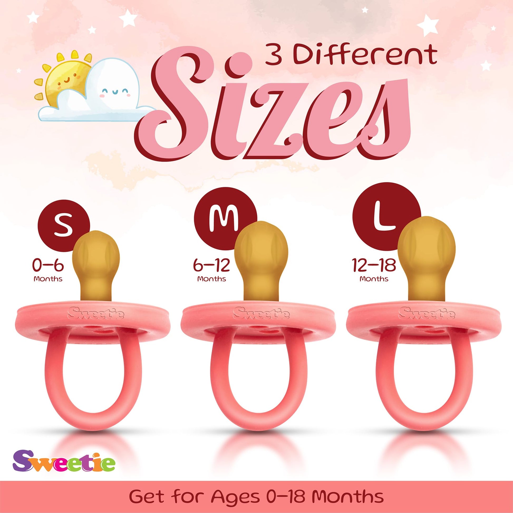 - Q: Are there different sizes available for the SWEETIE Rubber Pacifier? A: Yes, the SWEETIE Rubber Pacifier comes in three sizes to suit the needs of your growing baby.
