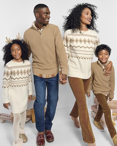 - Q: What design features does this sweater dress have? A: This dress includes a fairisle pattern, a rib-knit crew neck, long sleeves with rib-knit cuffs, and it is designed to hit above-the-knee.