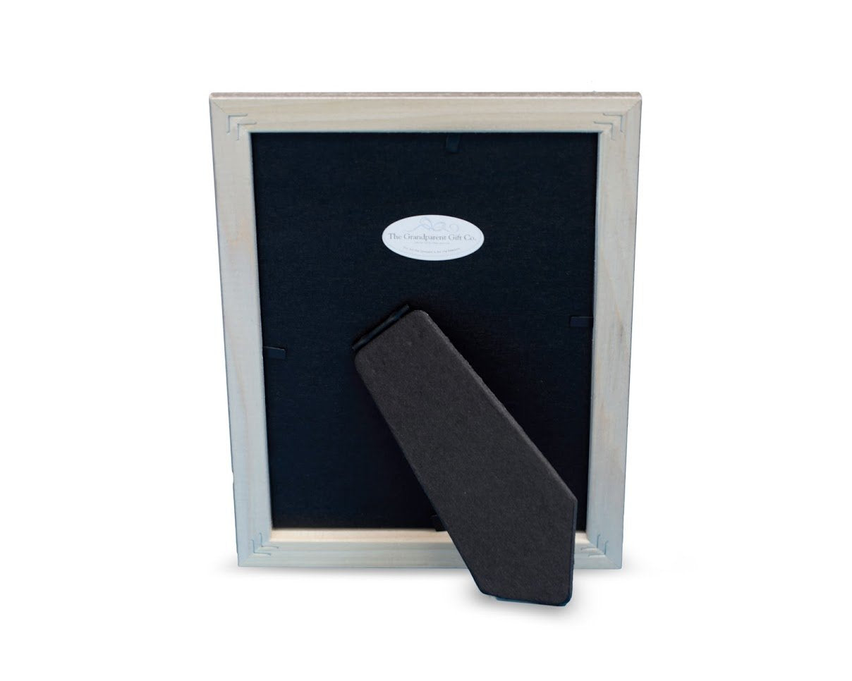 • Q: What materials are used in the frame? A: The frame is made of wood, and the handprint kit includes a child-safe charcoal gray stamp.