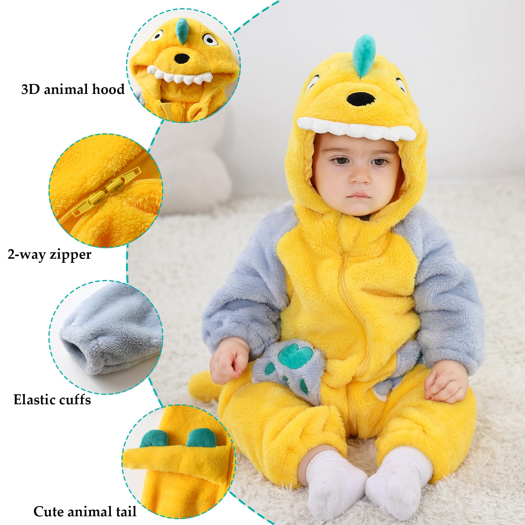3D Animal Design3D Dinosaur/Tiger/Unicorn/Pig/Sloth/Leopard/Elephant shaped costume,make your baby the most pretty role in the party Easy to Put on and Take off Convenient to Change Diapers Snaps/zippers closure at the crotch part Hooded, Hand Cover and Booties Keep your baby warm from head to toe, perfect to wear in cold and snow days. Hand cover fold back to expose hands, footies save your time putting shoes on your baby. You can't help but smile when you see your baby in it.Also it's a nice gift for someone Hand washing & Machine washing, The Mission Is To Help Baby Sleep and Play Comfortably It's the type of outfit that will fit a variety of sizes and can be worn multiple ways. They can wear it on its own or layer it and have a onesie or something under it for added warmth. It's made well with sturdy stitching and secure zipper.The eyes and face are sewn in so no worries that baby will dislodge a piece and cause a choking hazard. The way the zipper is placed it makes it super easy to get baby in and out of the outfit. Baby Skin Friendly Material:High-quality Thick Fleece, Polyester,comfortable and Warm to Wear for Baby.Made of high-quality flannel,soft,durable,breathable and comfortable to wear. Practical and Convenient-Long sleeve thick fleece romper keeps your baby warm and cozy, adorable and cute. Zipper design, easy to put on, take off and change diapers.Season: Spring, Fall, Winter.Best Gift for Baby.Soft and breathable fabric,Warm and fluffy-unisex for baby.