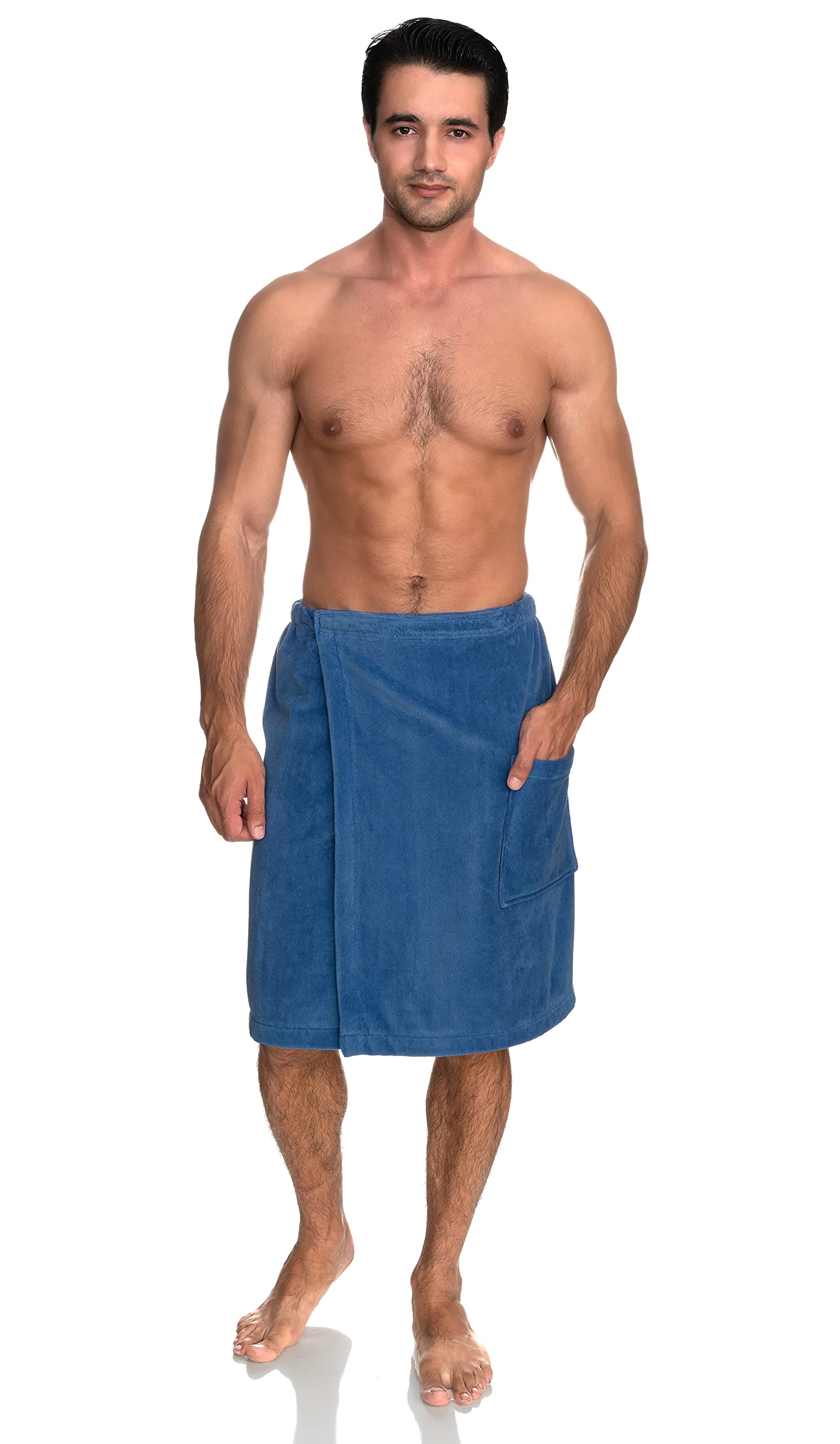 Mens terry velour shower and bath wrap is made of 100% absorbent cotton. Terry cloth interior, velour exterior shower wraps are designed for comfort and absorbency. Bath wraps can be used for bath, spa, shower or pool. Features front pocket and hook-and-loop fastener closure. Features: - Terry velour body wrap for men - Terry cloth interior, velour exterior shower wrap - Three different sizes available - Machine washable - 100% Premium Cotton Washing Instructions: - Machine washable, wash in warm water. Tumble dry low heat. - Wash and dry with hook-and-loop fasteners closed. Care Instructions: - Wash bath wrap separately from clothing. - Wash and Dry hook-and-loop fasteners closed. - Avoid contact with skin care products. Some skin care products may stain your bath wrap. - Adding 1/2 cup of white distilled vinegar to the rinse water will remove any detergent build-up and the lint. - Avoid using bleach, fabric softeners and dryer sheets. Bleach breaks down the cotton fibers. Softeners reduce absorbency. - If you see a pulled loop on your bathrobe, please cut the pulled loop with a pair of scissors. This will not damage the item.
