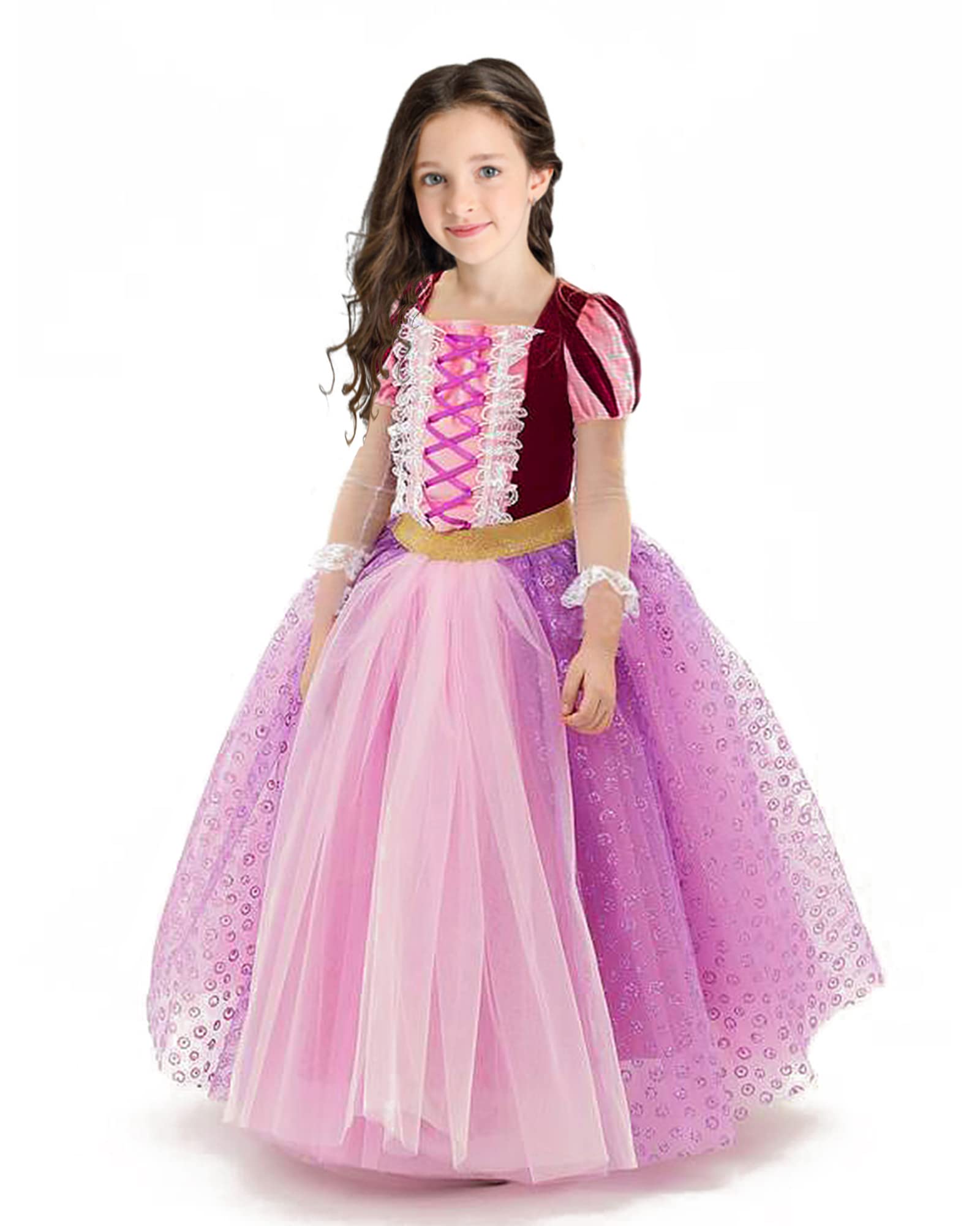 • Q: What style does the Rapunzel dress feature? A: The dress features a ball gown design with puffy sleeves and a soft velvet top, making it a beautiful choice for little princesses.