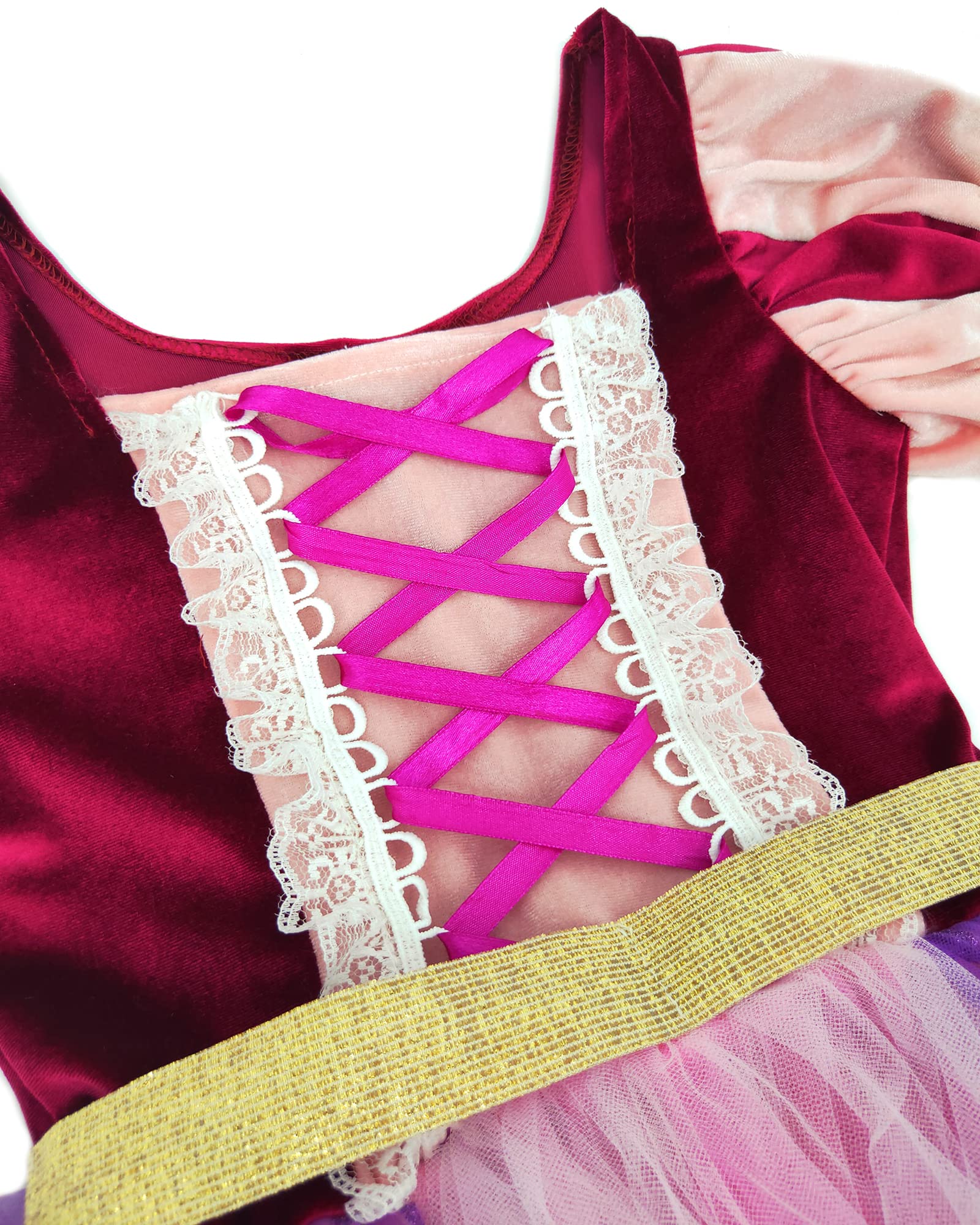 • Q: What materials are used in the Rapunzel dress? A: The dress is made of quality fabric including velvet and tulle, with a 100% cotton lining and polyester.