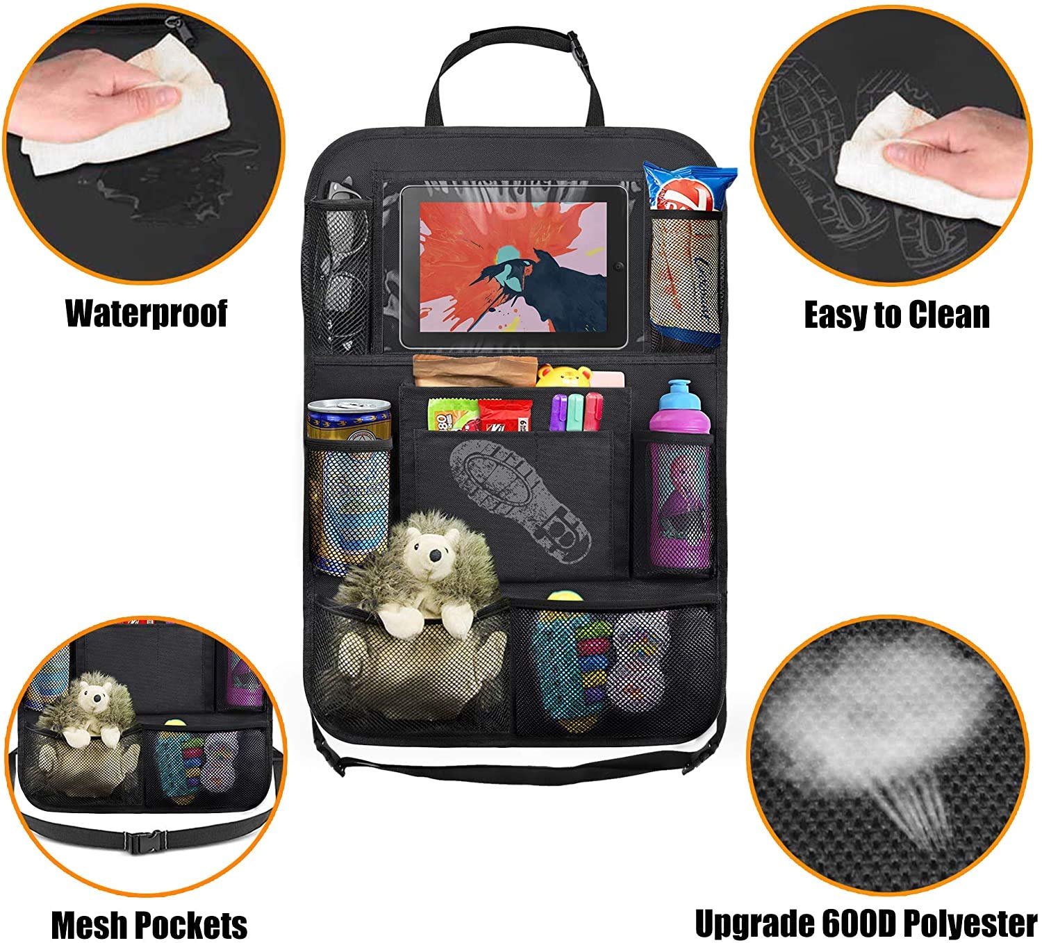 - Q: What material is the ULEEKA Car Backseat Organizer made from? A: The organizer is made from improved stronger 600D Polyester and waterproof frosted PVC.