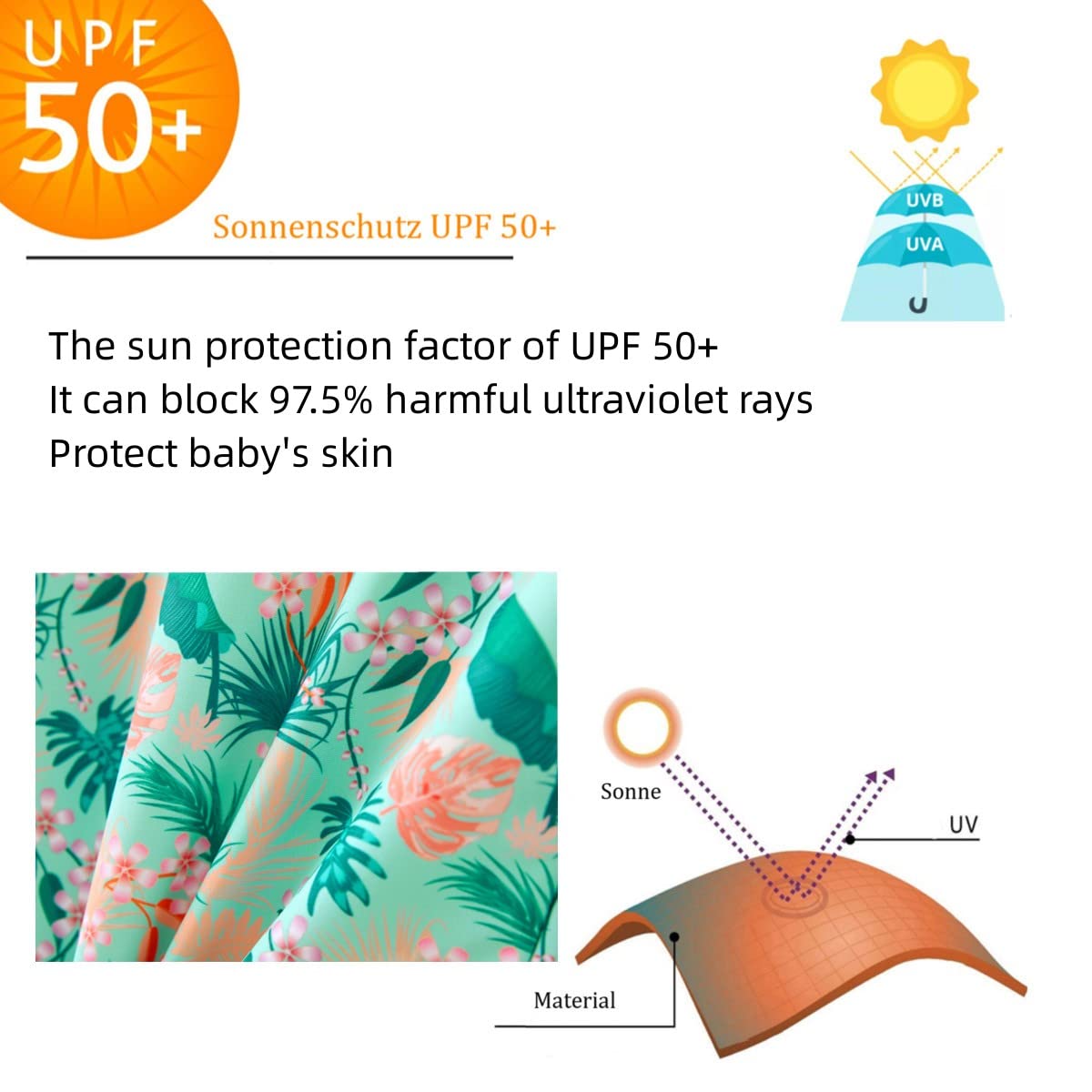 - Q: Can this swimsuit help prevent sunburn? A: Yes, the long sleeves and UPF 50+ protection help prevent sunburn while your baby plays in the water.