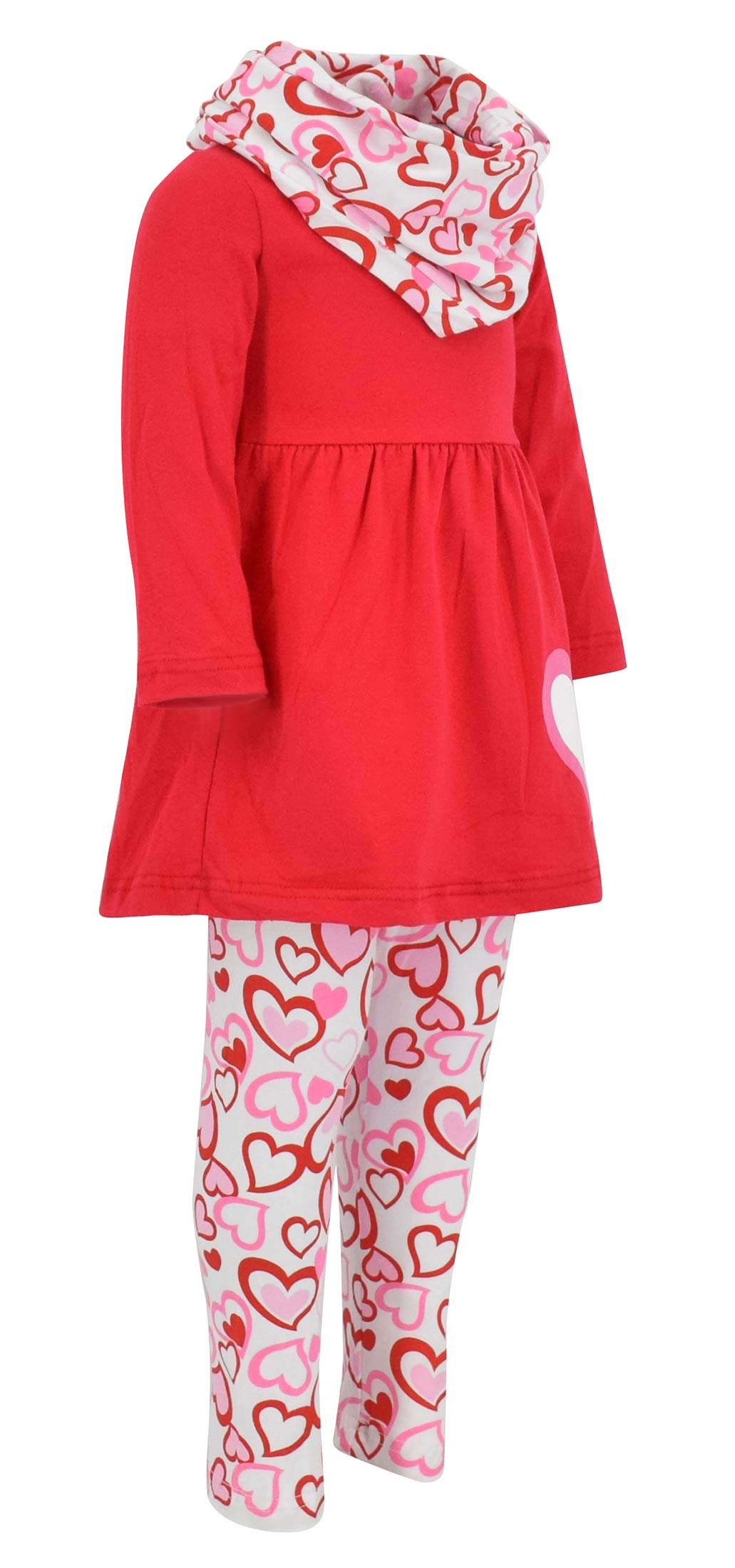 - Q: What is included in the Unique Baby Girls Valentines Day Legging Set? A: The set includes a red long sleeve tunic top, a pair of pink, red, and white heart decorated leggings, and a matching scarf.