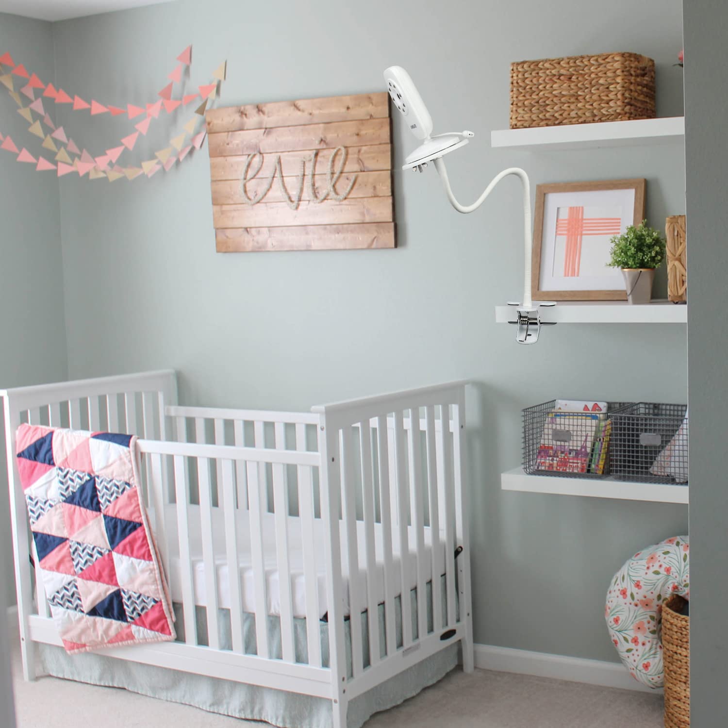 - Q: How do I install the baby monitor mount? A: Installation is simple and tool-free. Just clip the mount to your crib or any suitable furniture like a shelf or table, and adjust it as needed. No drilling or wall damage is required.