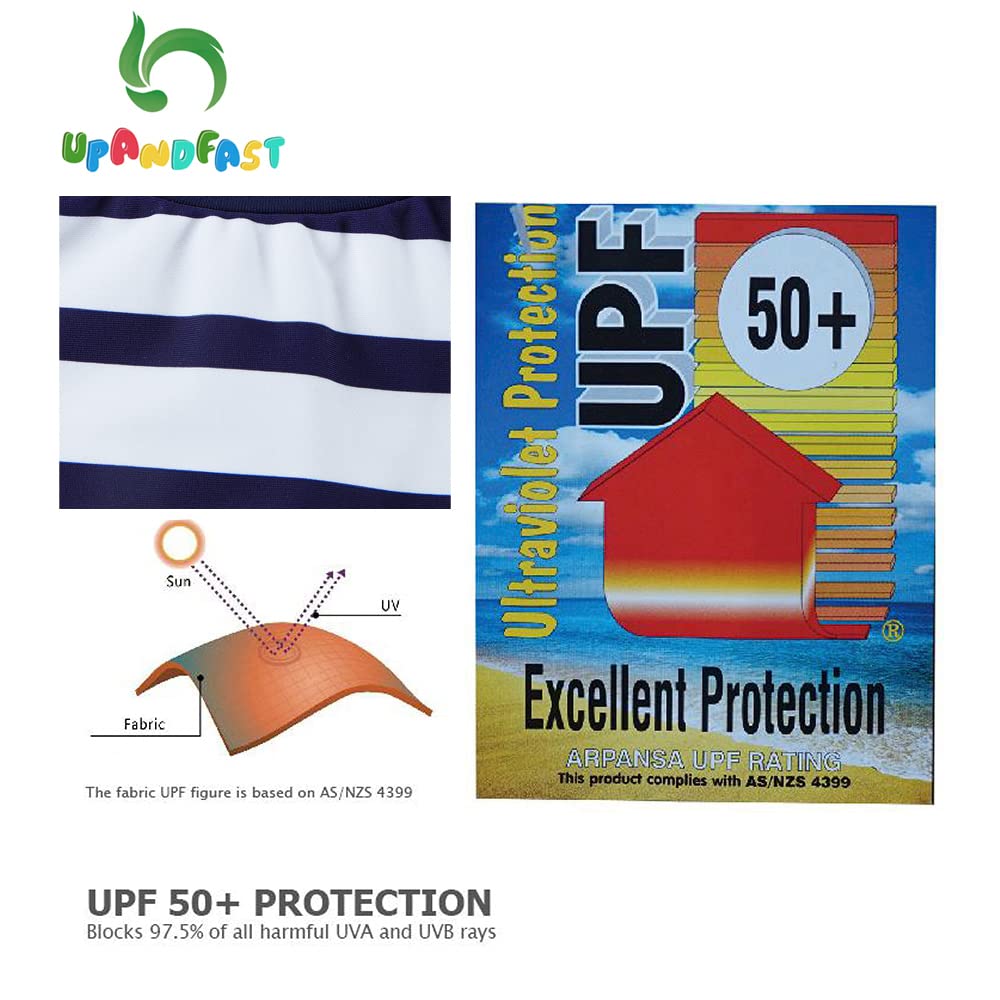 - Q: How does the UPF 50+ sun protection work? A: The UPF 50+ sun protection in this swimsuit blocks 97.5% of harmful UV radiation, helping to keep your baby safe in the sun.