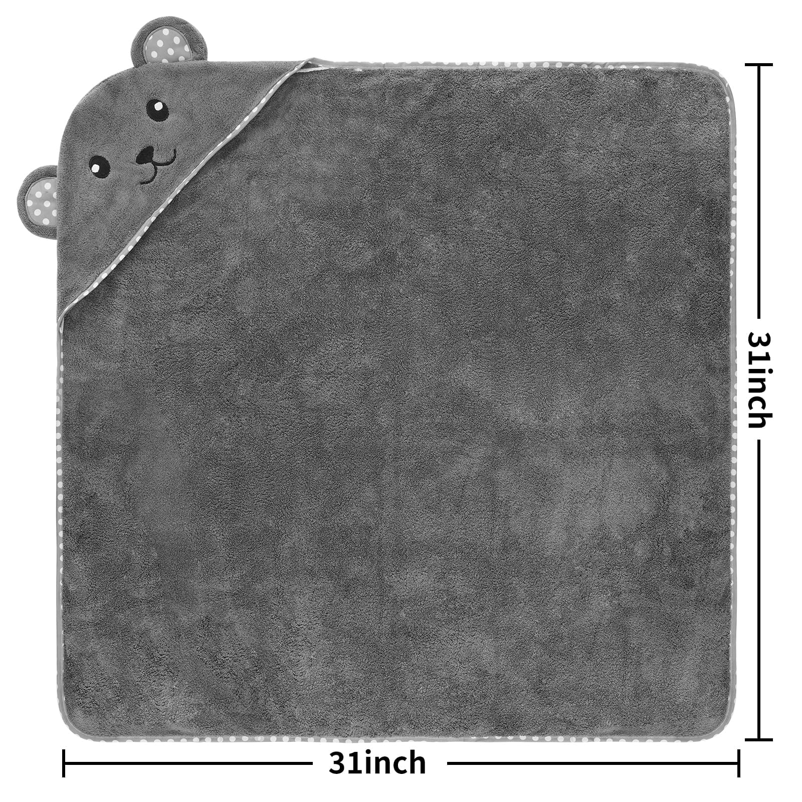 - Q: What are the dimensions of the hooded towel? A: The towel measures 31 x 31 inches, making it suitable for newborns, infants, and toddlers.