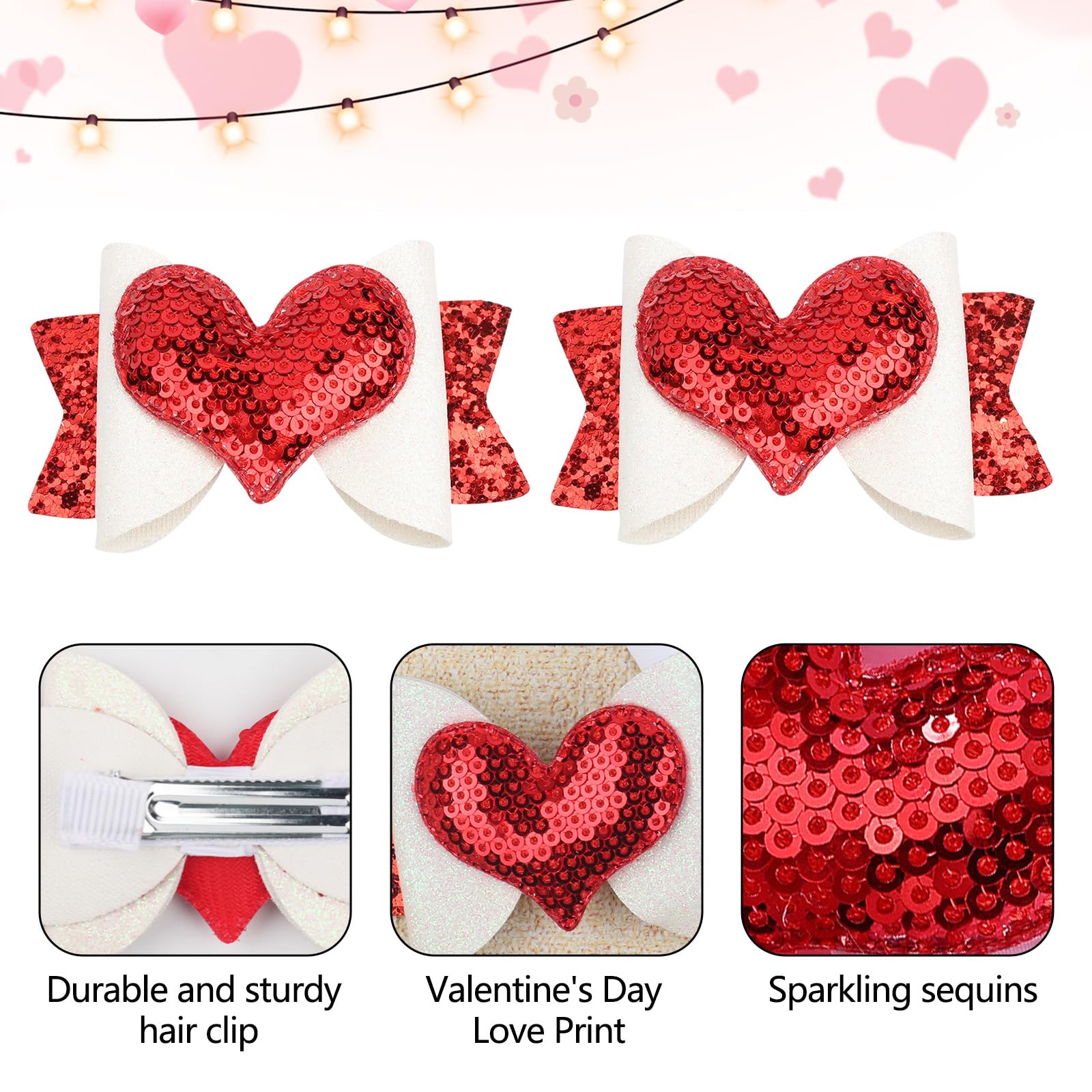 - Q: What is included in the Valentine Hair Bows package? A: The package includes two Valentine Hair Bow Heart Hair Clips designed for girls.