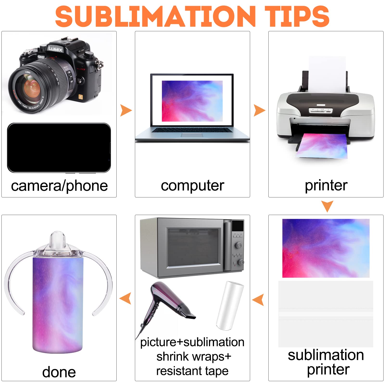 - Q: Does the cup come with lids and straws? A: Yes, the package includes two 12-ounce sippy cups, two straws, two screw-on lids, six sublimation shrink wraps, and heat-resistant tape.