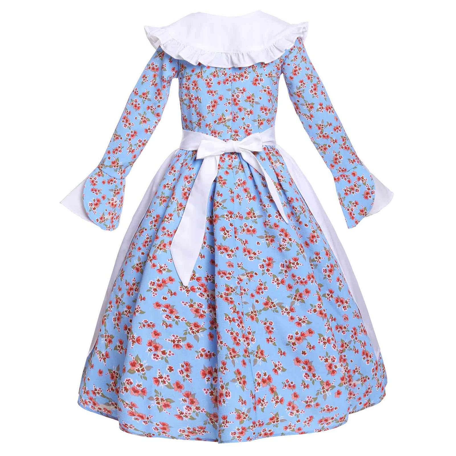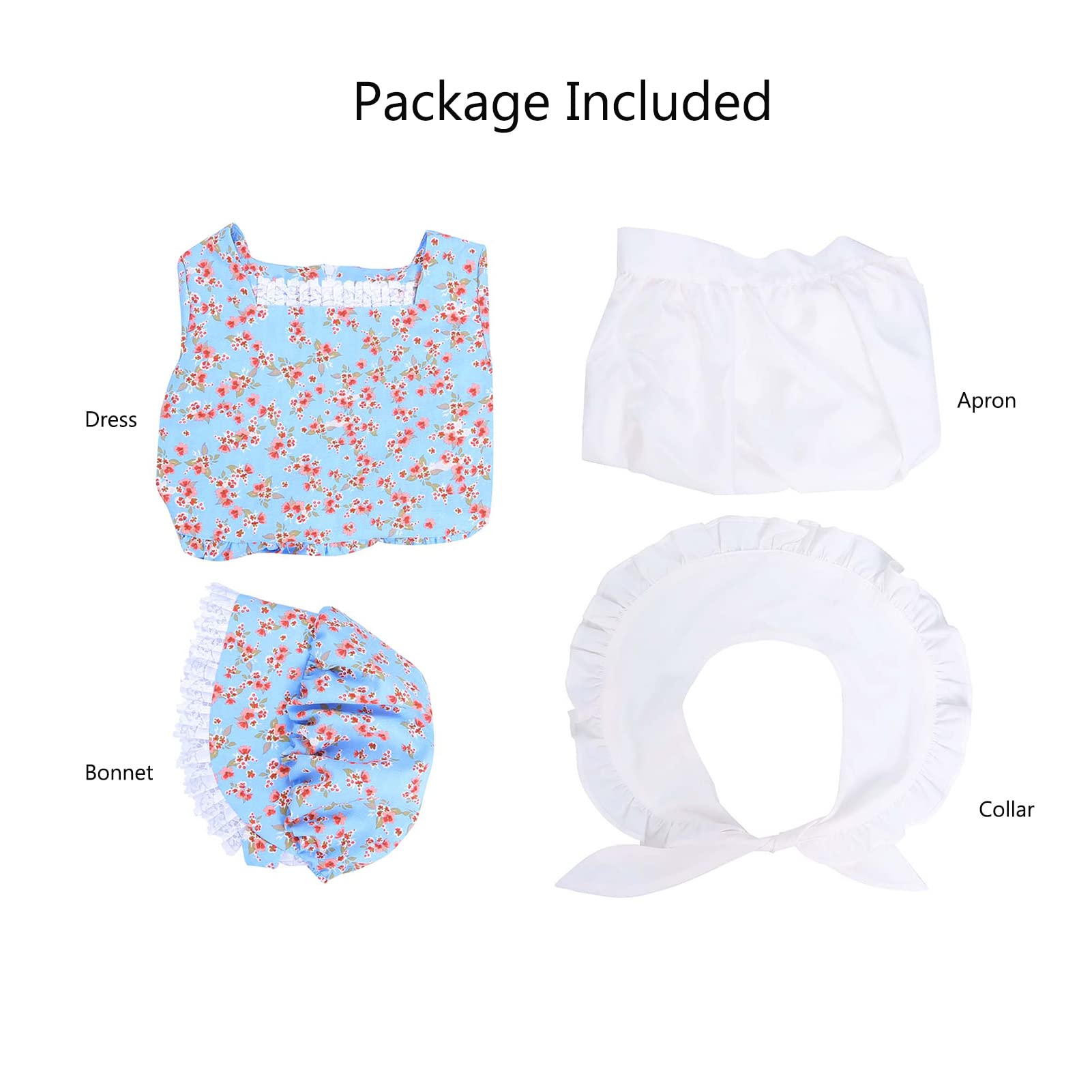 - Q: What does the costume set include? A: The costume set includes a full-length long-sleeved prairie dress, a ruffle hem sailor collar, a white half apron, and a calico bonnet.