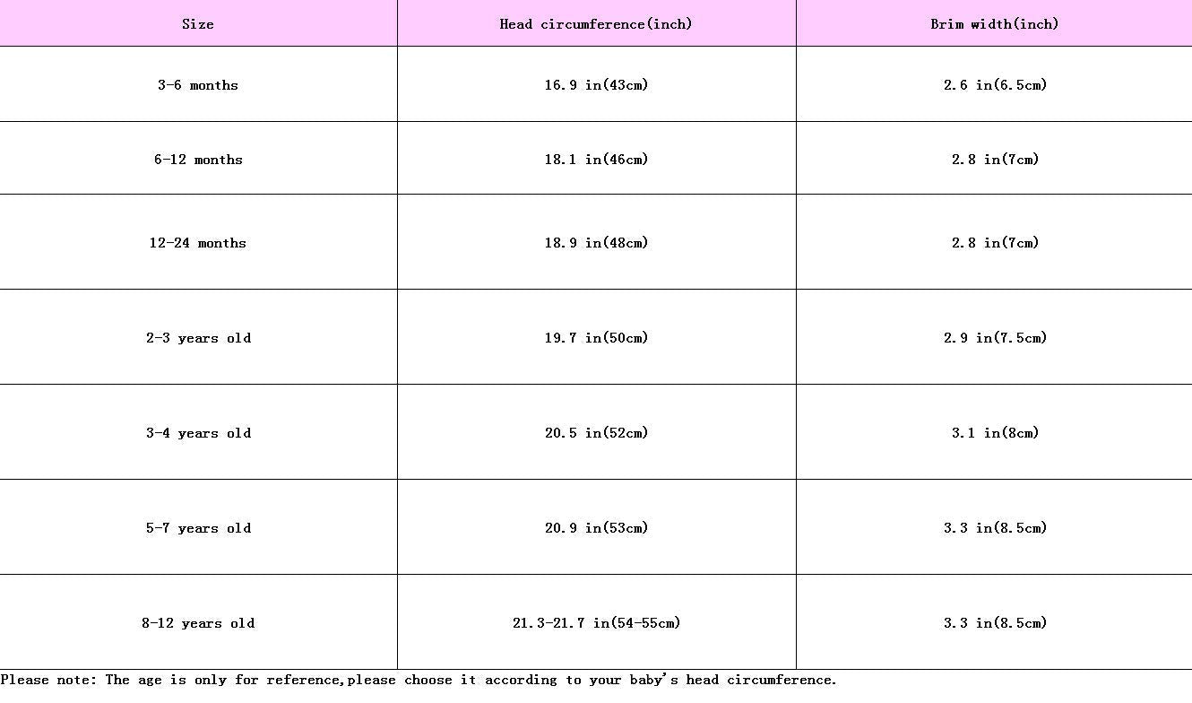 - Q: How do I choose the right size for my child? A: Refer to the hat circumference measurements: for 3-6 months, it's about 16.9 inches; for 6-12 months, about 18.1 inches; for 12-24 months, about 18.9 inches; and so on, up to 21.7 inches for ages 8-10 years.