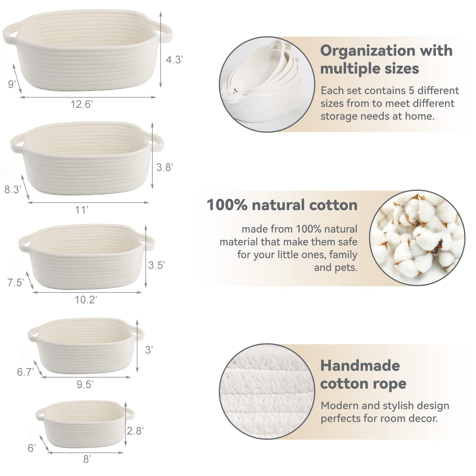 - Q: What sizes are included in the VOOWO Set of 5 Rope Baskets? A: The VOOWO Set includes five baskets in varying sizes: Extra Small (8 x 6 x 2.8 inches), Small (9.5 x 6.7 x 3 inches), Medium (10.2 x 7.5 x 3.5 inches), Large (11 x 8.3 x 3.8 inches), and Extra Large (12.6 x 9 x 4.3 inches).