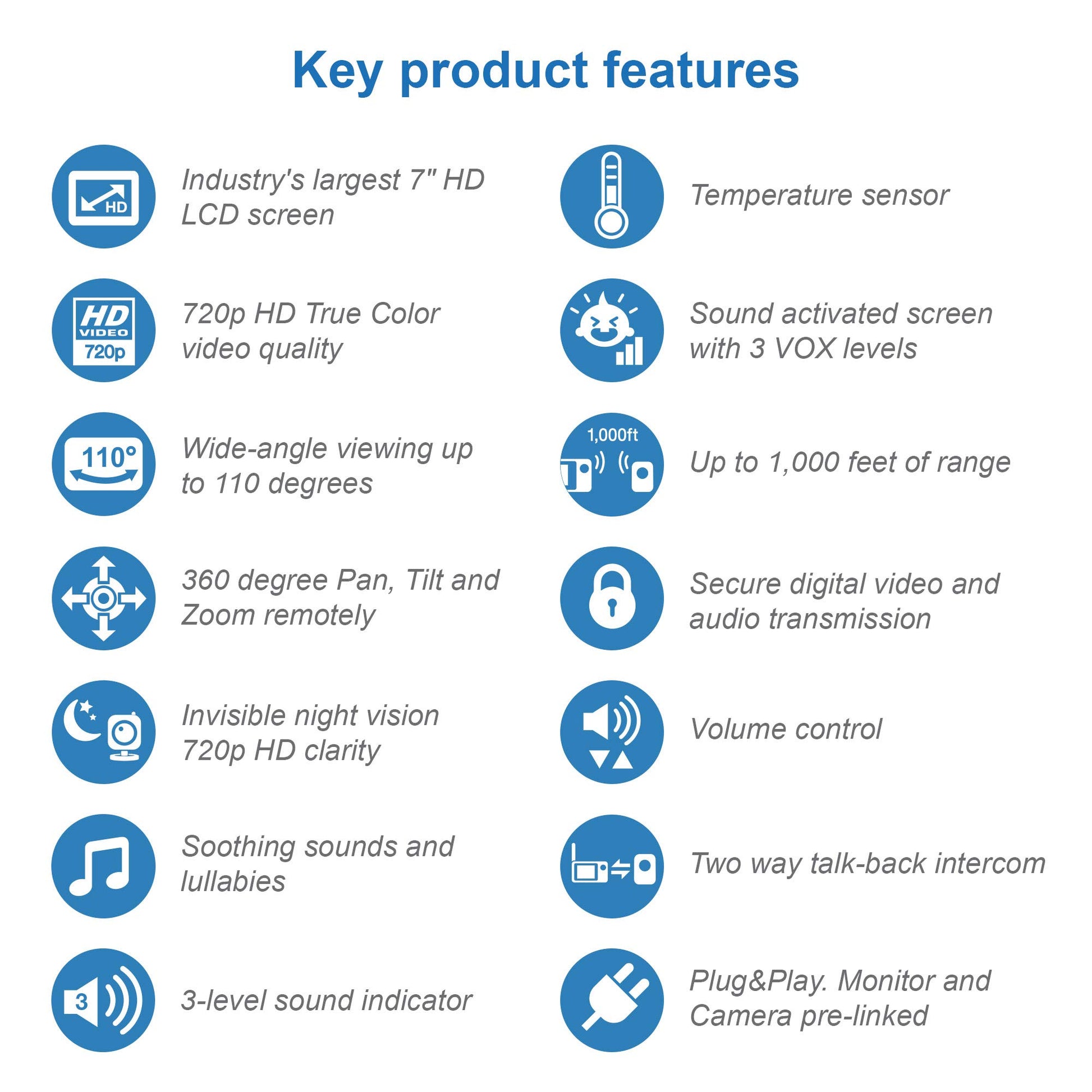 - Q: What features help me monitor my baby at night? A: This video monitor includes HD night vision capabilities, allowing you to see your baby clearly in low-light conditions, along with sound-activated alerts to notify you of any noises.