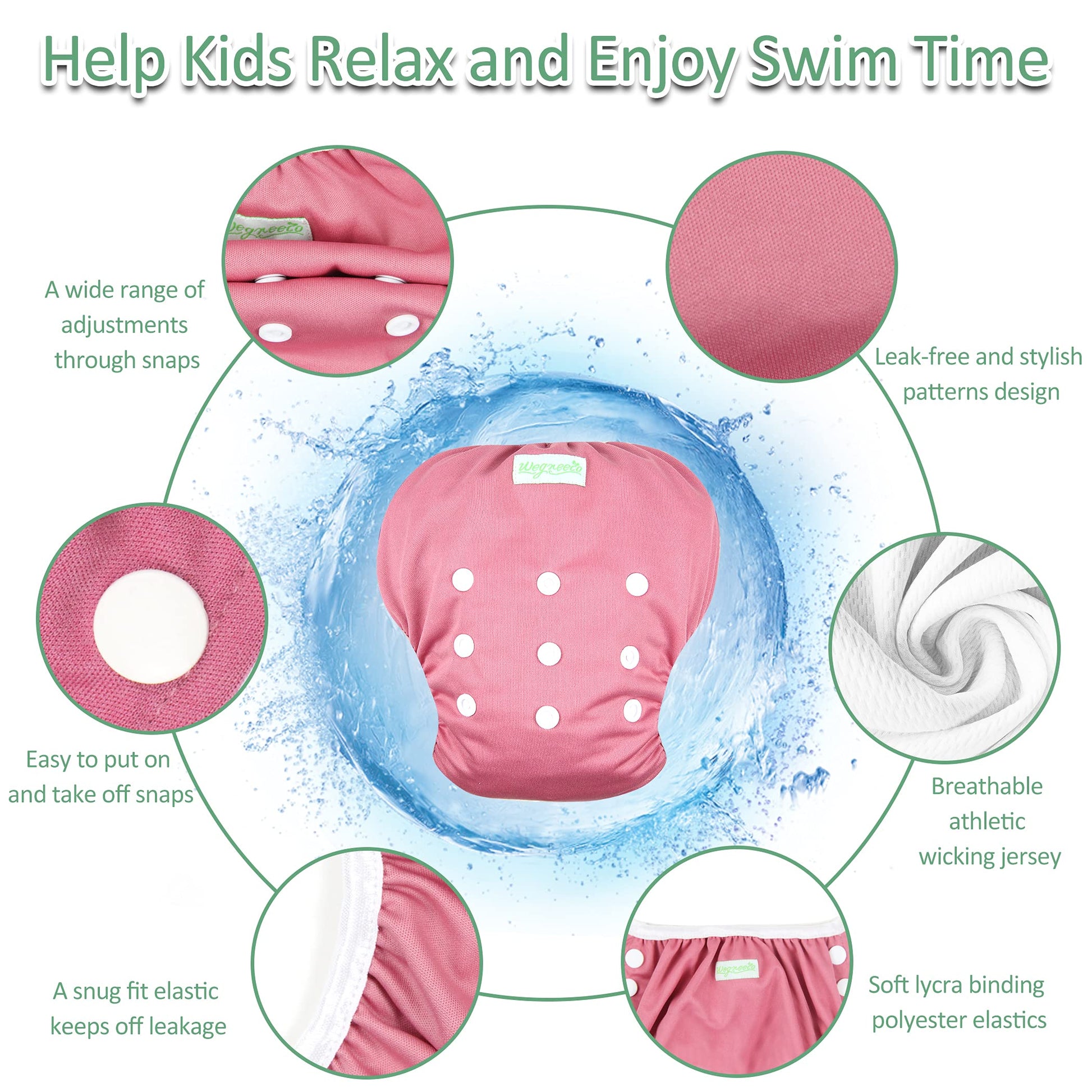 - Q: Is the swim diaper adjustable? A: Yes, the Wegreeco Swim Diaper features adjustable snaps at the front and waist, allowing you to customize the fit for your baby as they grow.