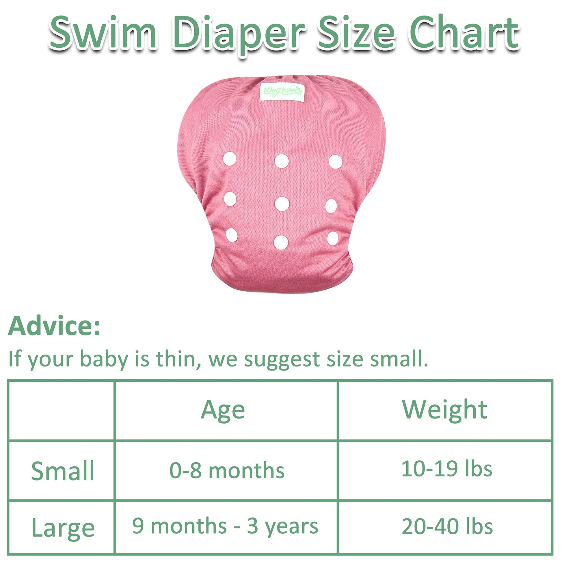 - Q: What sizes are available for the Wegreeco Baby Swim Diaper? A: The Wegreeco Baby Swim Diaper is available in two sizes: Size Small, suitable for babies aged 0-8 months with a weight range of 10-19 lbs, and Size Large, designed for babies aged 9 months to 3 years, weighing between 20-40 lbs.