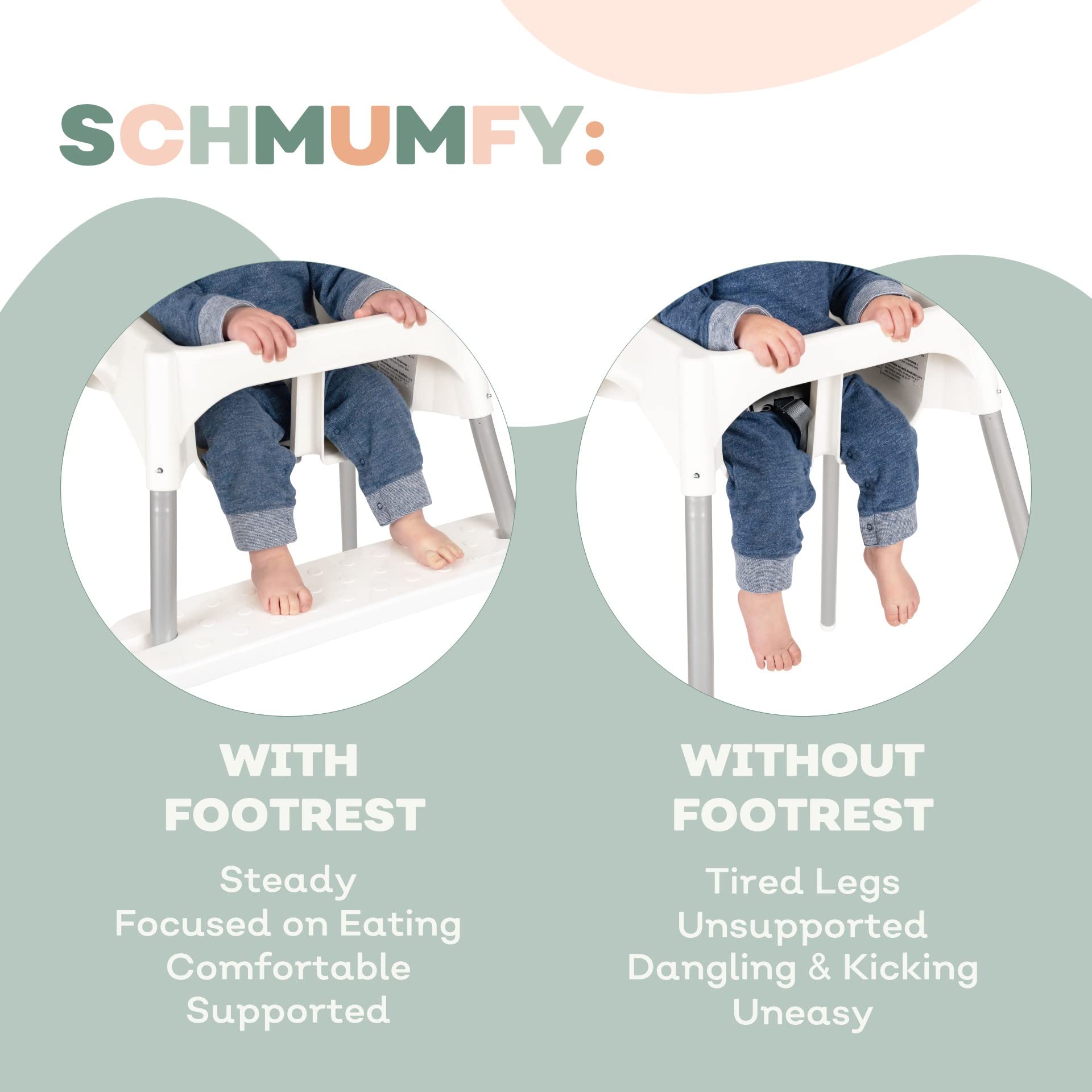 - Q: What is the weight limit for the SCHMUMFY footrest? A: While specific weight limits are not provided, the footrest is designed to support infants comfortably during mealtime.