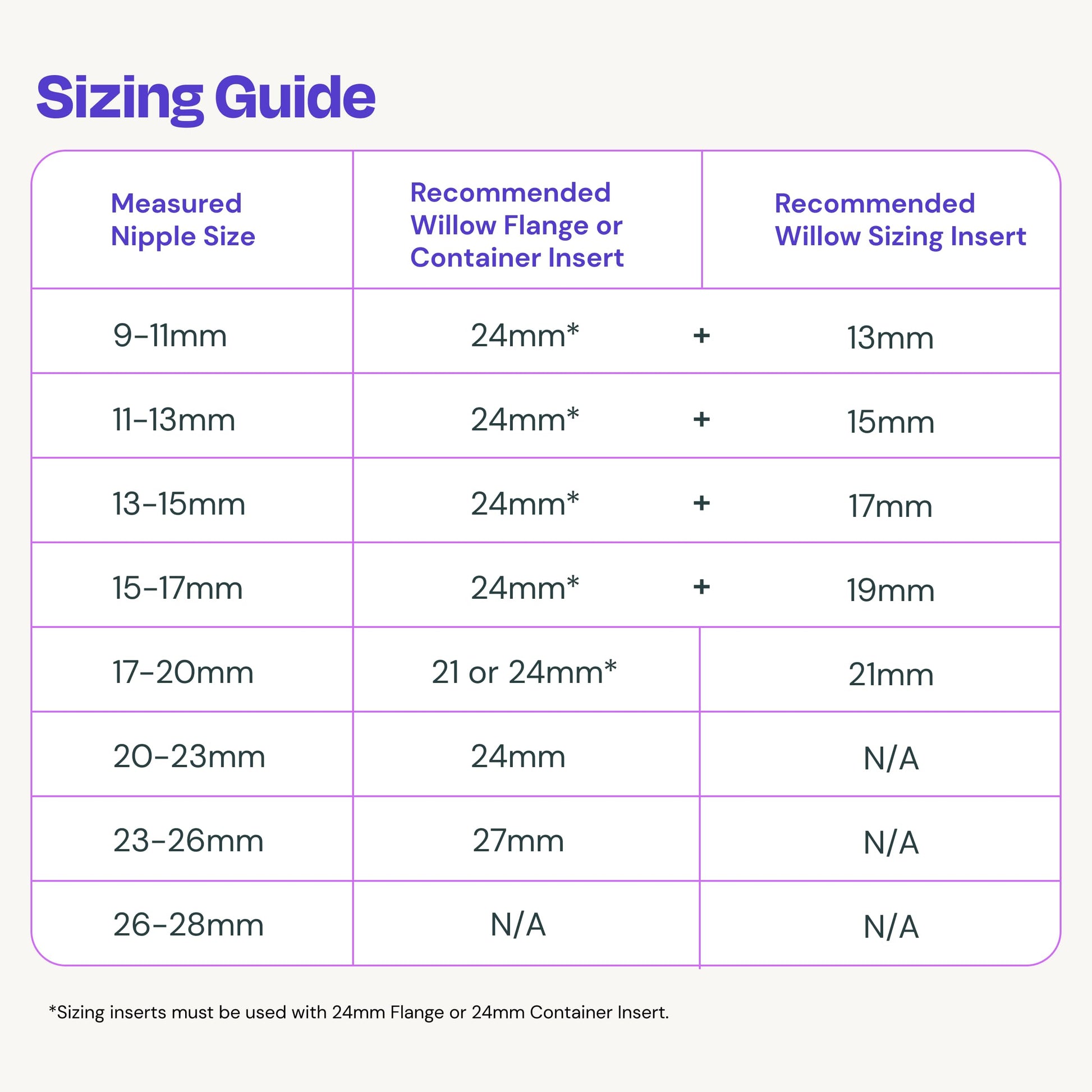 - Q: How do I know which size flange to choose? A: To find your perfect fit, refer to Willow's sizing chart that will guide you in selecting the right flange size for your breast shape.