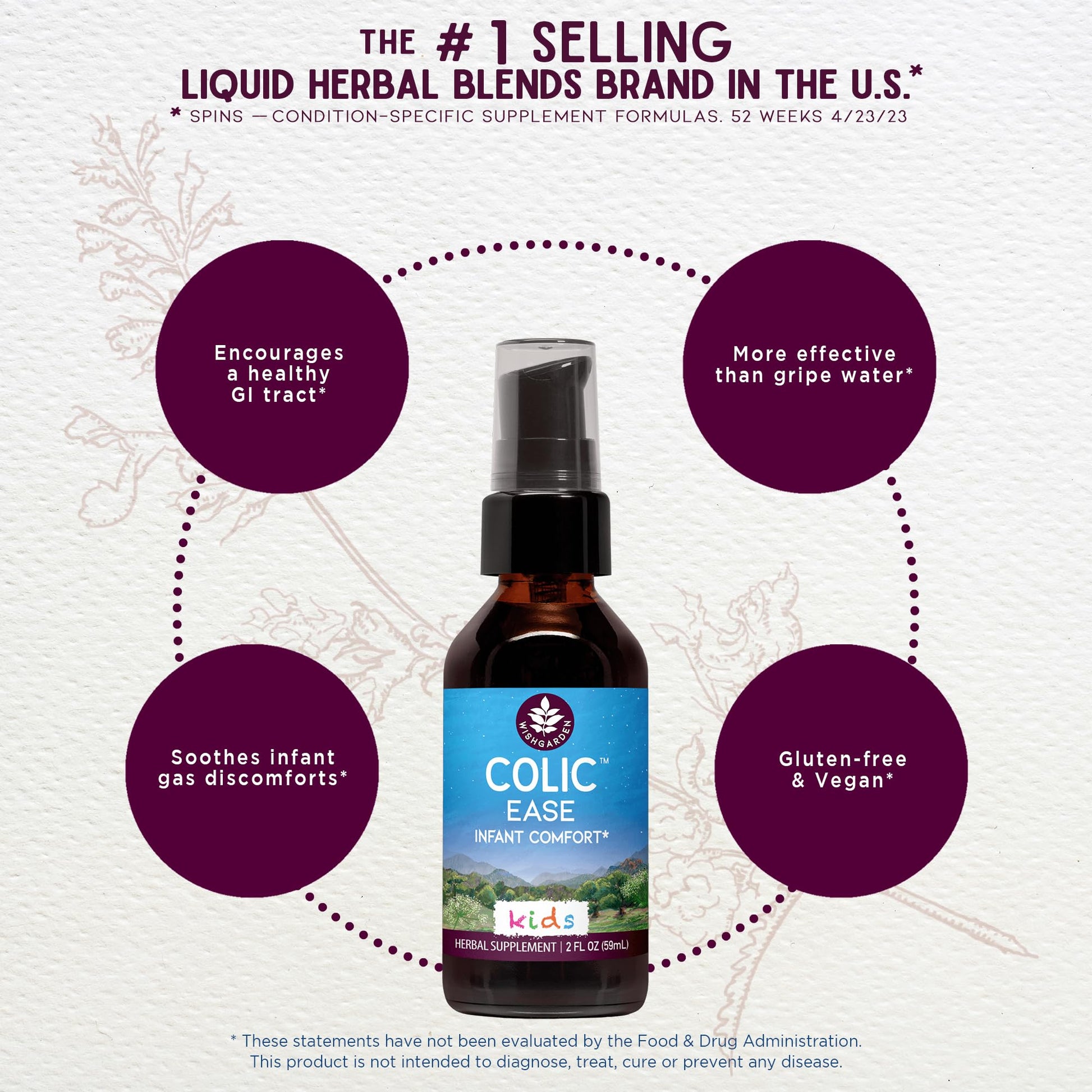QUICK COLIC RELIEF FOR NEWBORNS: Colicky babies and are no fun for anybody. WishGarden Herbs' Colic Ease colic drops and gas drops for babies support an infant's healthy GI track. This plant-based colic relief for newborns and gas relief for baby herbal formula is lovingly crafted by our founder, a midwife, for use on infants. Colic Ease is more effective than gripe water for infants. | LIQUID BABY COLIC AND GAS RELIEF TINCTURES ARE QUICKER AND MORE EFFECTIVE: Liquid herbal extract drops are easily absorbed by the body, more effective than gripe water for infants. Easily customize each serving of our baby colic & gas relief drops to best meet your newborn's needs. Our innovations have raised the bar on efficacy and convenience with dependable in-the-moment remedies. | ORGANIC & WILD-HARVESTED INGREDIENTS: Our staff of highly-trained certified herbalists use only quality-tested, non-GMO ingredients to produce our signature small-batch formulations that support our bodies in the way nature intended. Made with baby-safe herbs Fennel seed, Catnip aerials and Peppermint leaf, gentle herbs known to calm the digestive tract. Colic Ease colic relief for newborns drops relief supplement is gluten-free and vegan. | COMMITMENT TO SUSTAINABILITY: We make Colic Ease infant gas relief drops from a love of plants and the earth, so sustainability is very important to us. Each of our herb suppliers and farmers go through an extensive screening process and annual review and must meet our high standards for sustainability & quality. | RADICALLY EFFECTIVE REMEDIES SINCE 1979: We are herbalists, botanists, scientists and naturalists making this colic calm supplement with Catnip, Fennel and Peppermint the old-fashioned way, using only the cleanest, most vibrant ingredients for optimal potency, efficacy and safety. Woman-owned and family run, WishGarden self-manufactures all of our liquid herbal extracts in Boulder, Colorado.
