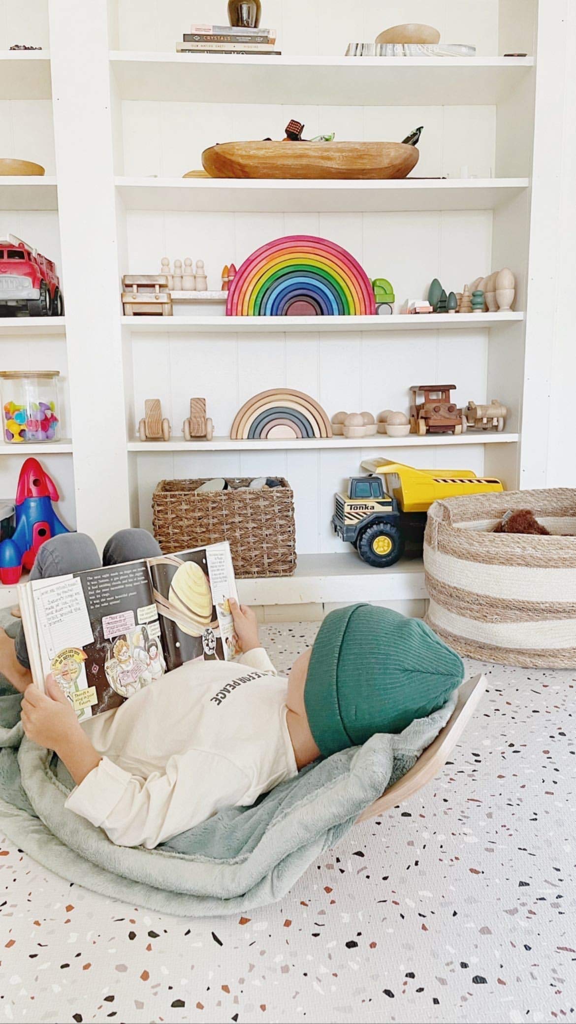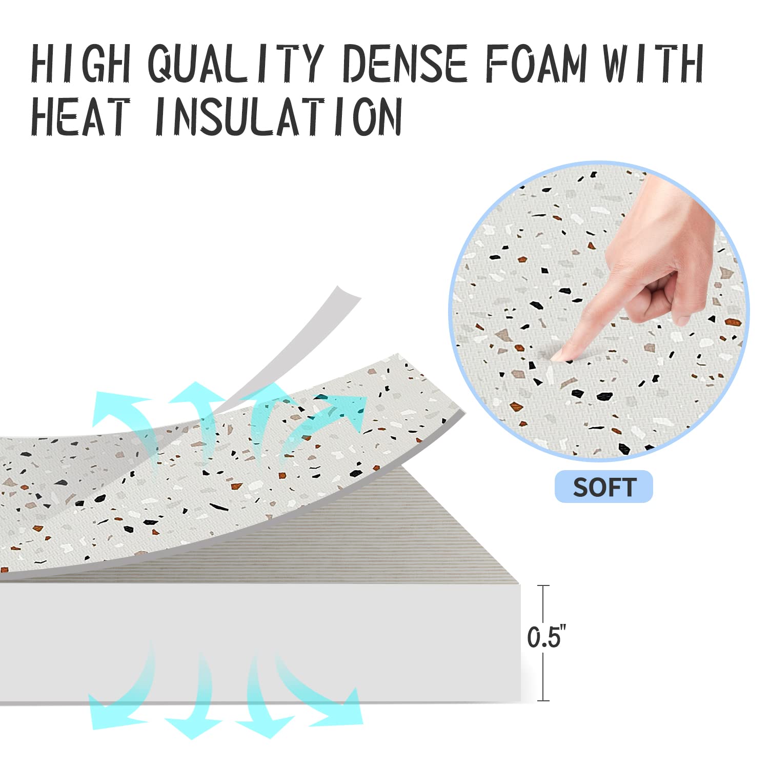 - Q: What is the design of the mat? A: The mat features a modern gray terrazzo design with black, white, brick red, and taupe accents, making it a stylish addition to any playroom.