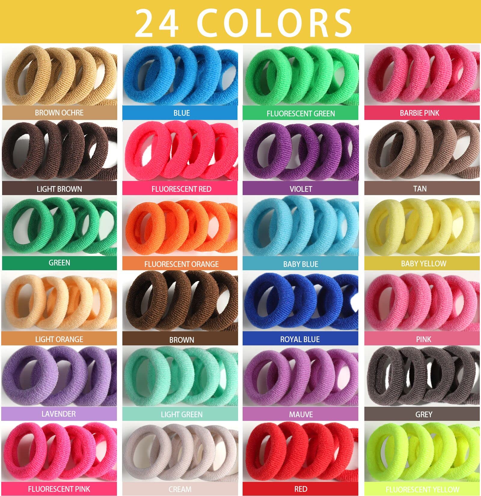 - Q: How many hair ties are included in the set? A: The set includes a total of 280 pieces of soft seamless hair ties in 24 different colors.