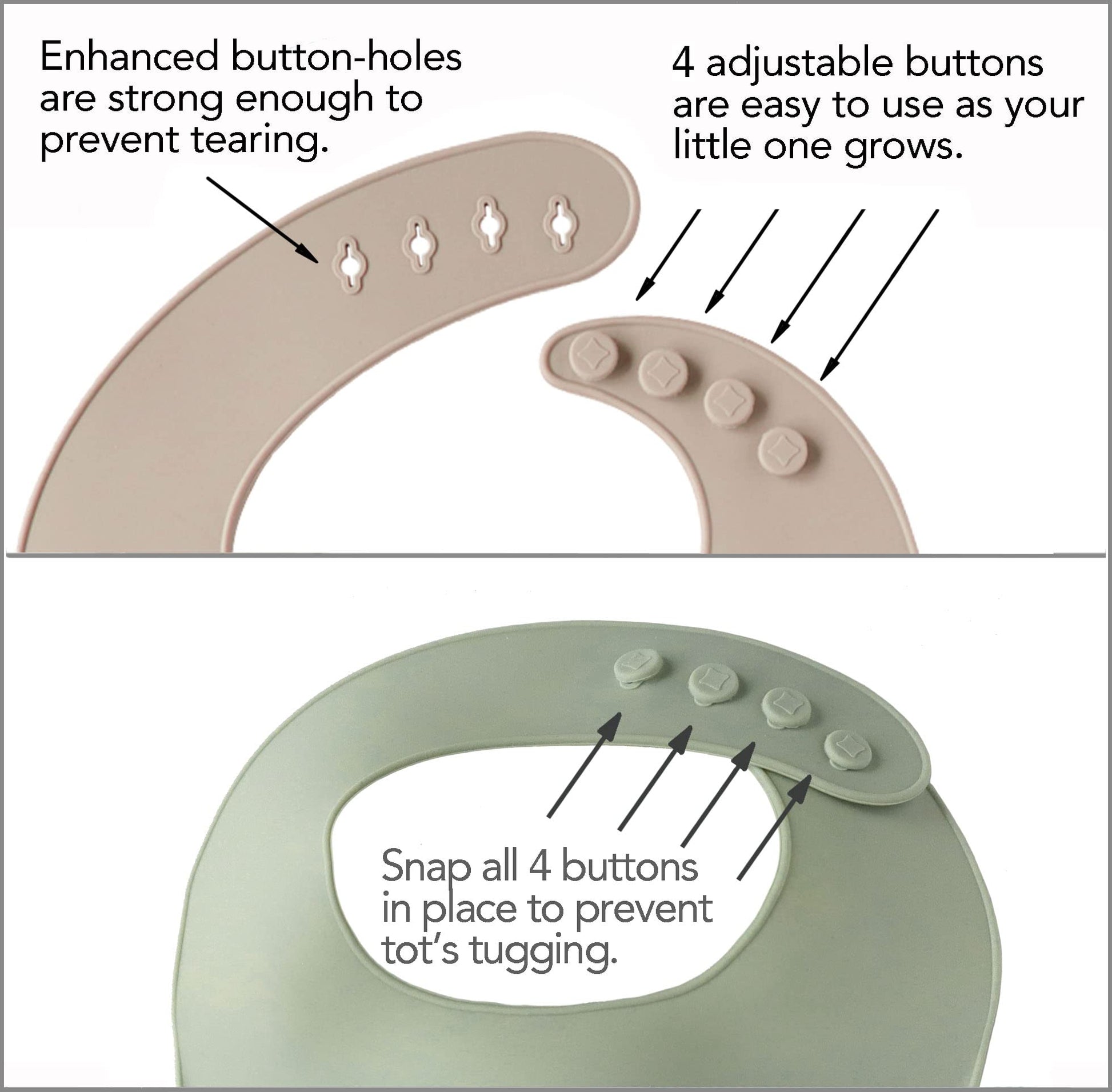 - Q: Is the silicone bib adjustable as my child grows? A: Yes, the bib features three easy-to-use buttons that are secure enough to resist tugging and can be adjusted as your child grows.