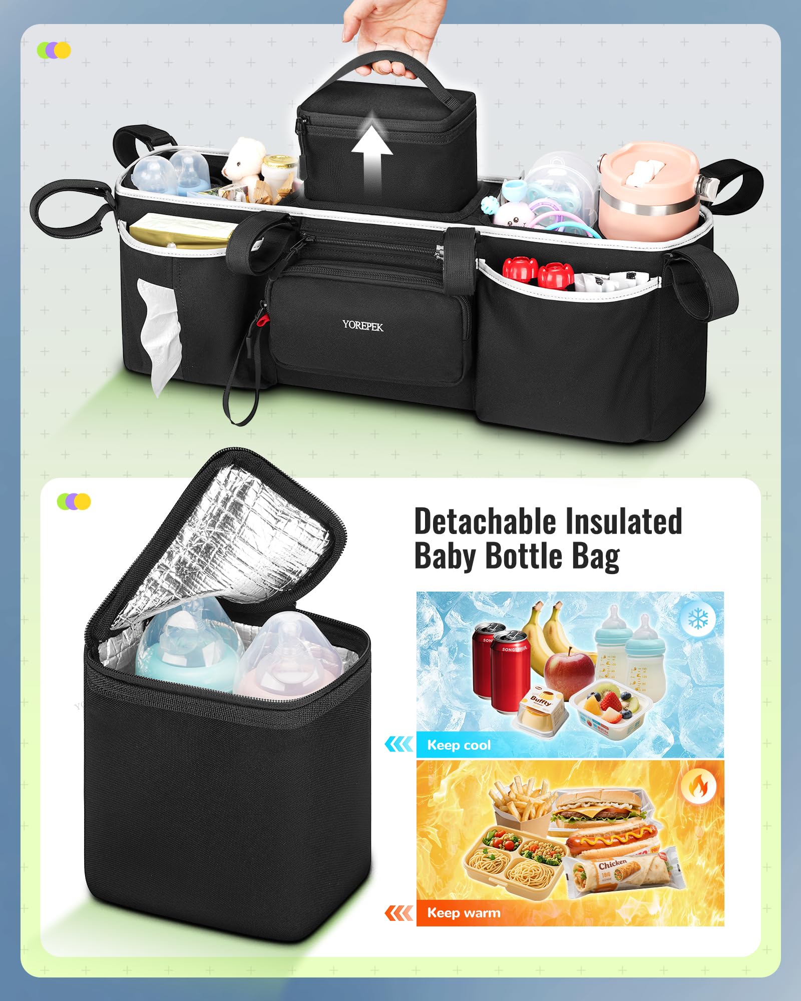 - Q: How does the organizer improve outings with a baby? A: The YOREPEK stroller organizer offers convenience through organized storage, ensuring quick access to baby essentials, and includes a cooler bag for temperature control, making outings easier and less stressful for parents.
