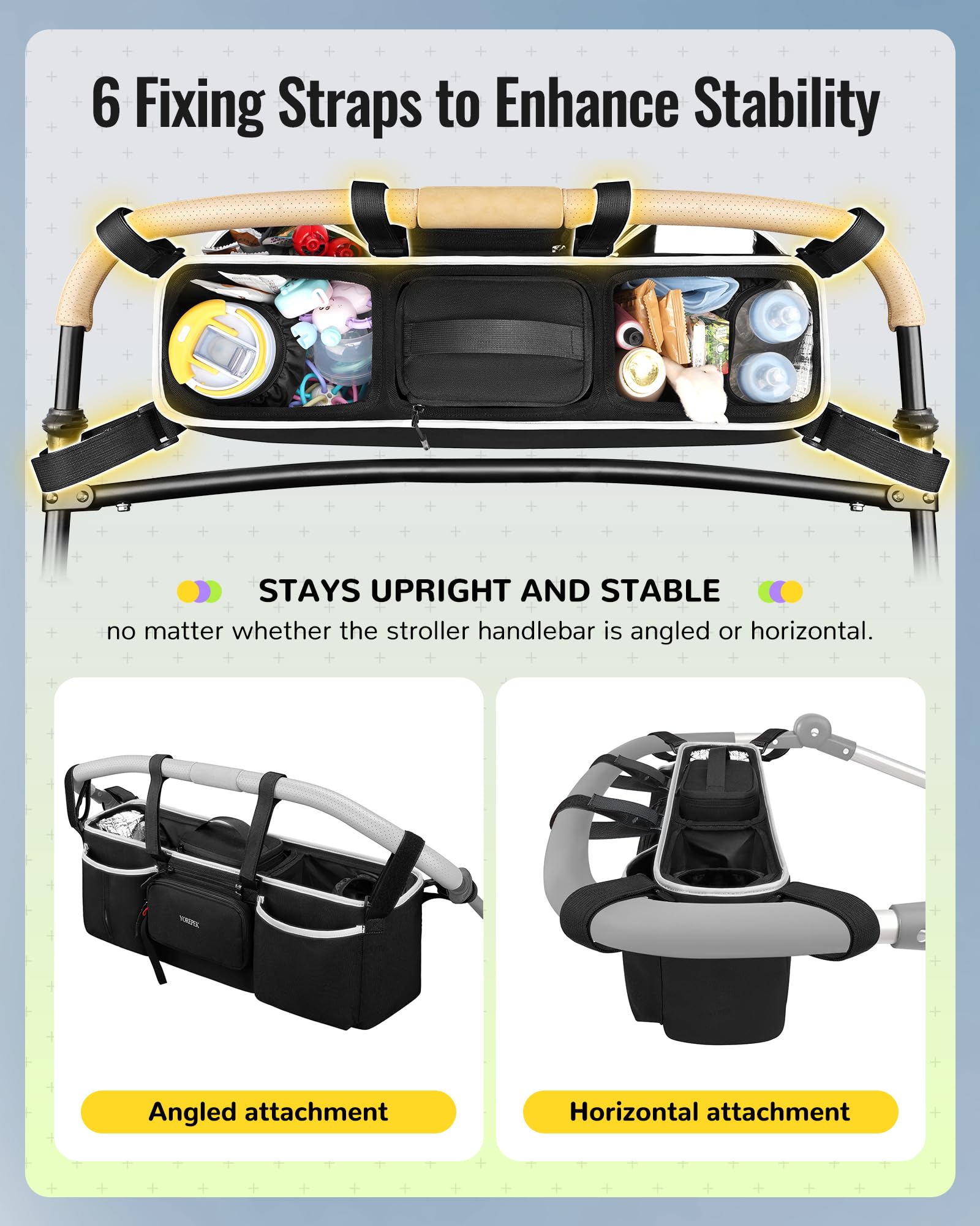 - Q: Are the straps adjustable for different stroller types? A: Yes, the YOREPEK stroller organizer features six adjustable hook-and-loop straps that can flexibly fasten to stroller handlebars at various angles, ensuring a secure and stable fit.