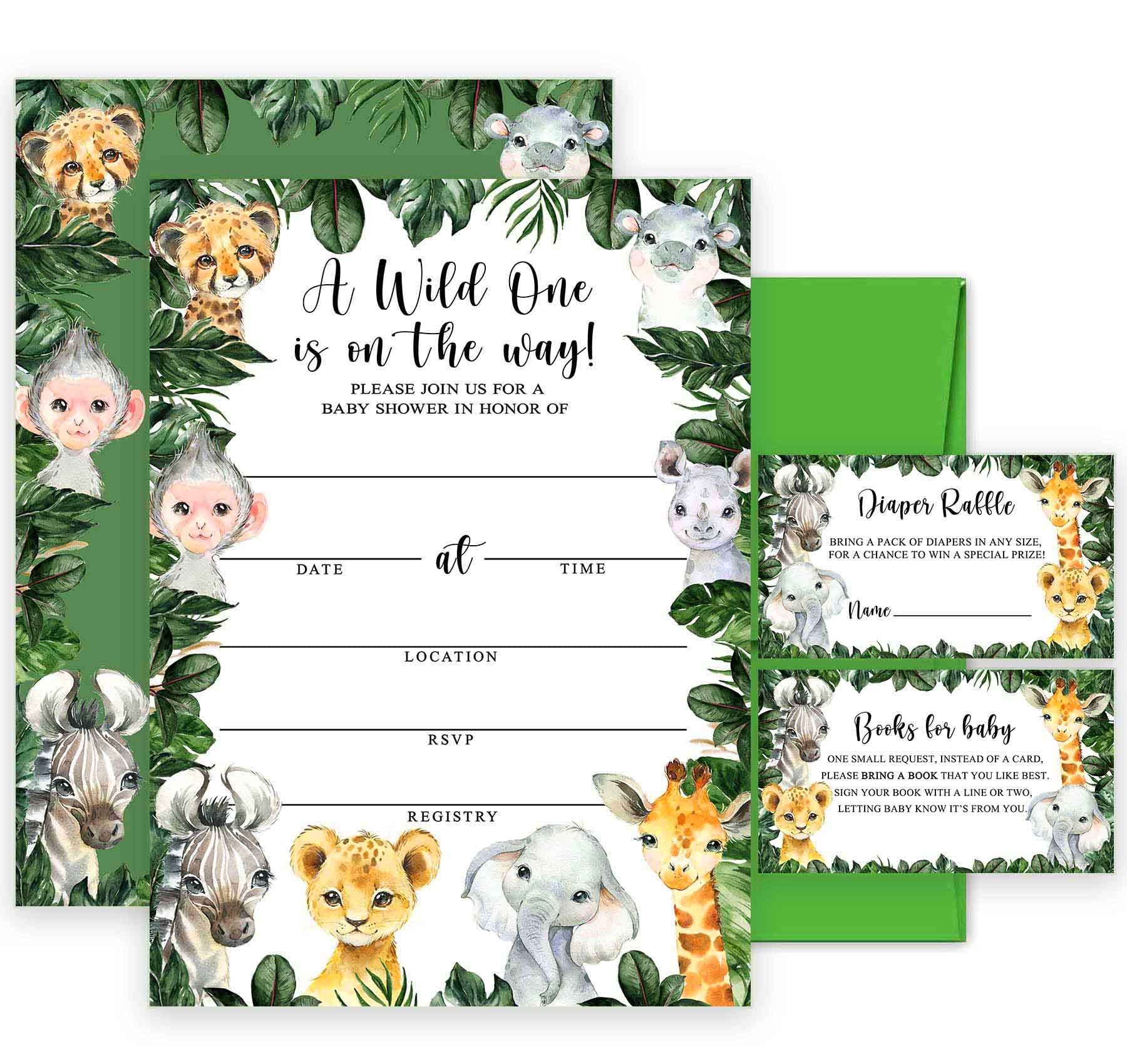 - Q: What is included in the Yuzioey Safari Baby Shower Invitations package? A: The package includes 50 double-sided invitations, 50 matching envelopes, 50 diaper raffle tickets, and 50 book request cards.