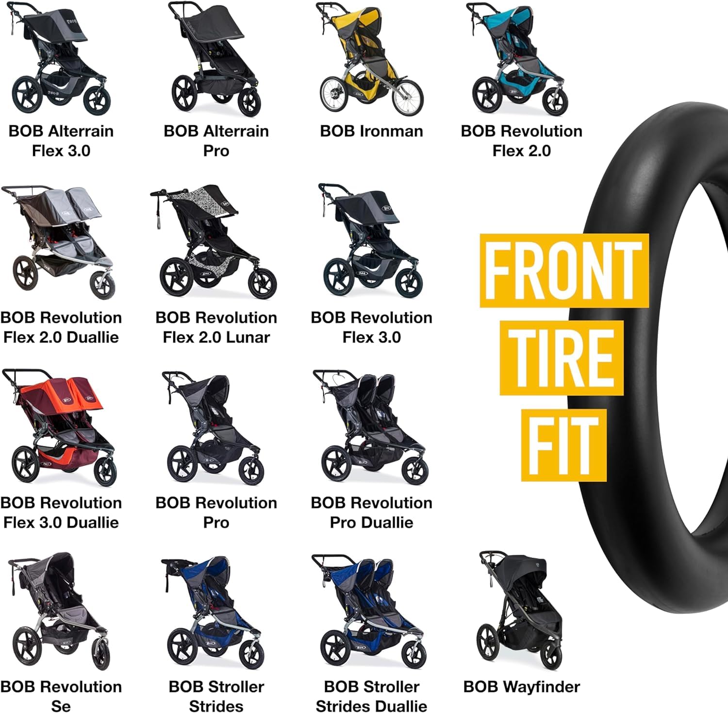 - Q: What models are compatible with the ZOZOZO BOB Stroller Tire Tubes? A: These inner tubes are designed to work with all Bob Jogging Strollers and Double Bob Strollers, including models with 16 inch rear wheels and all front tires for the Wayfinder, Revolution FLEX/Pro/Original/SE, Alterrain & Alterrain PRO, Strides Fitness Strollers, IRONMAN, and all Duallies.